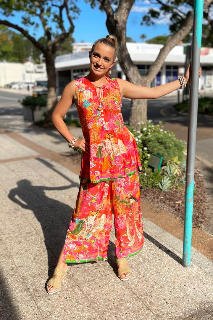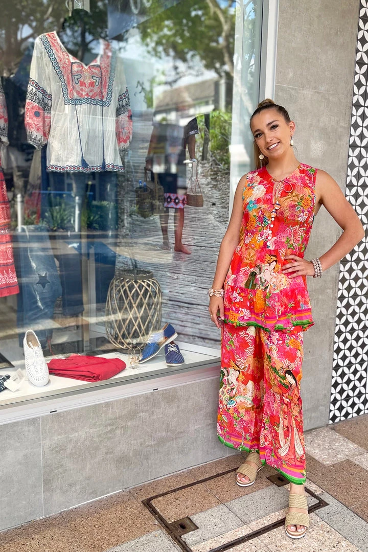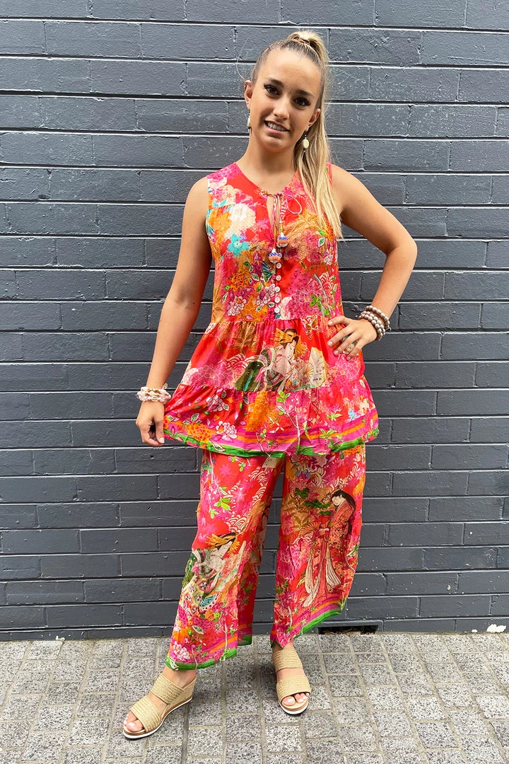 Satana Pants are style and comfort just as you like it. Pull on with an elastic waist. There is a false zip and button detail on the front. The pants fall beautifully to an ankle length. The bottom of the pants are embellished with crystals and have a cute split on the outside. Pair with a plain coloured shirt or the matching top RY21