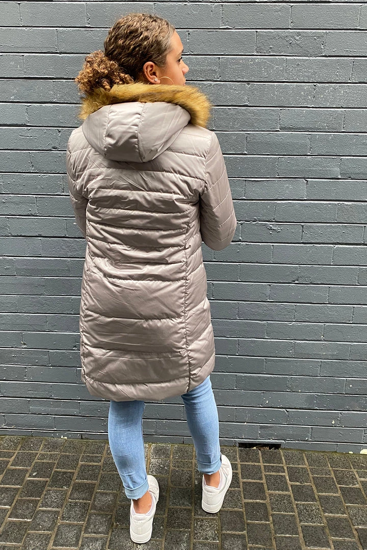 You will be as warm as toast in this feather and down puffer jacket with faux fur trim on the hood. This long line puffer jacket is perfect for early morning walks on chilly winter mornings – it is sure to keep you as warm as toast.