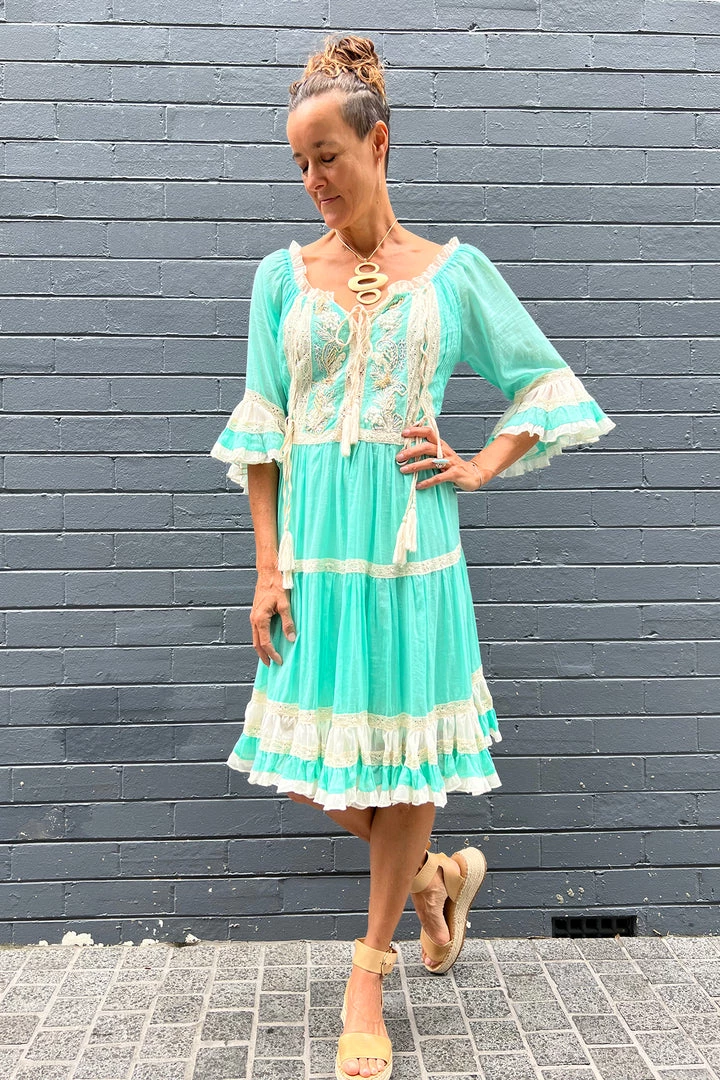 You can have breakfast, lunch and dinner in the Tiffany frill neck dress. So fine and delicate. The neckline is elastic that can be worn off the shoulder. The applique on the front has gold and sliver. The skirt falls away with chiffon and ruffles to finish the hem. This detail is also on the sleeve.Â