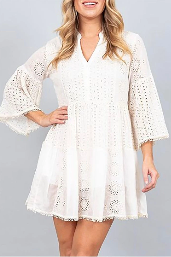 You’ll feel like a princess in the luna lush dress. In cream with beautiful gold shimmer though out the whole dress, So easy to wear, light and cool, With the long fluted sleeves featuring broderie anglaise all as detail of the dress, it’s perfect for all occasions, It has a round neck that falls to a V, It has a tiered skirt above the knee with a cotton crocheted trim. Slip this one on over your head, pair with heels or sandals and away you go.Â