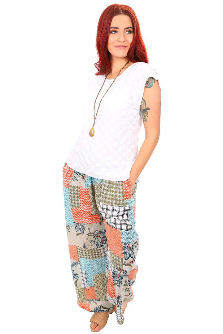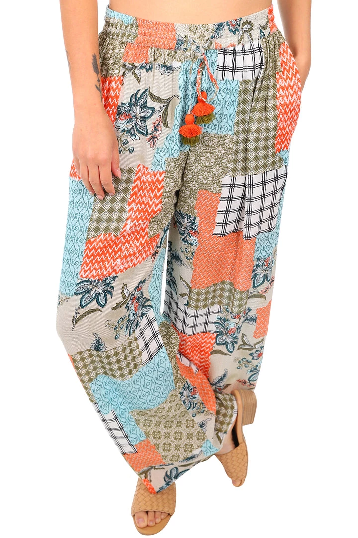 These beautifully printed Patchwork Pants are a boho sensation this season! Featuring an elasticated waistband and wide legs to provide the ultimate in comfort and style with sideseam pockets adding functionality to the design. Simply add sandals and a sunhat to begin your day.
