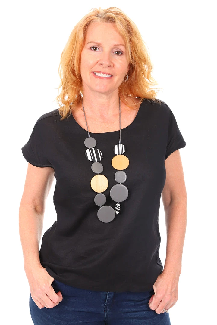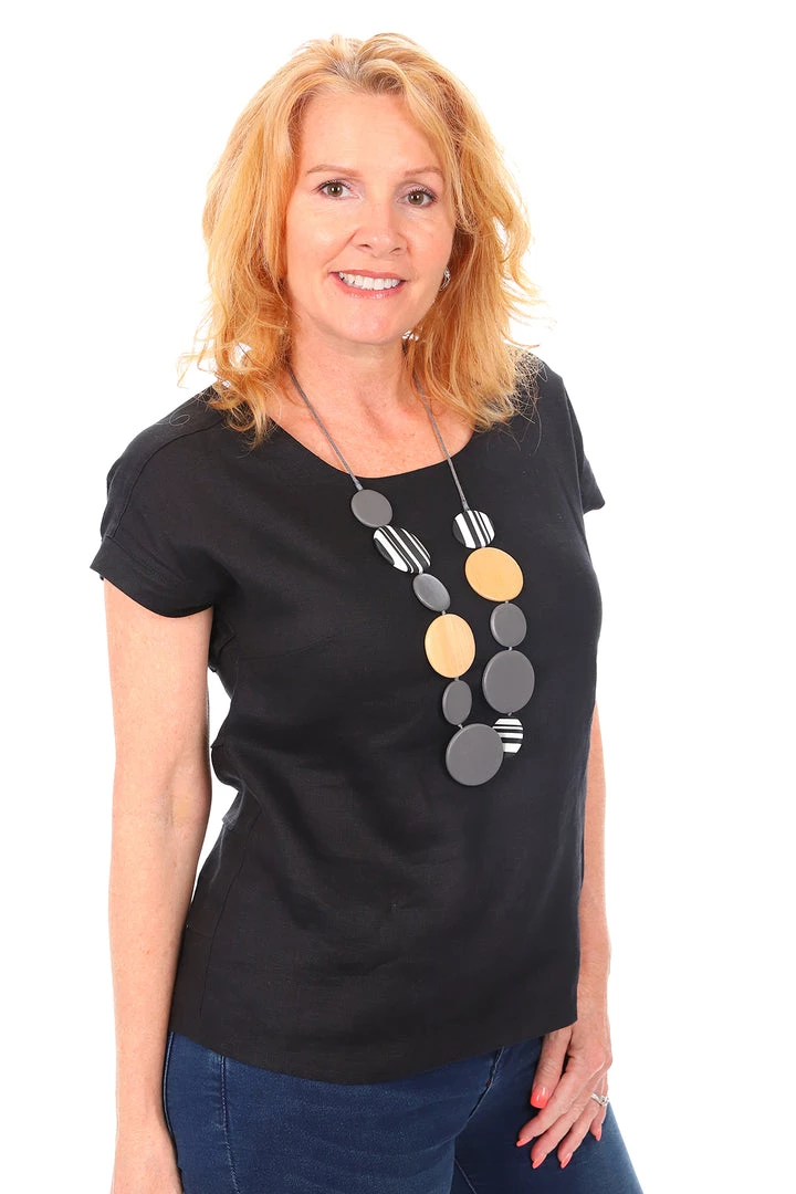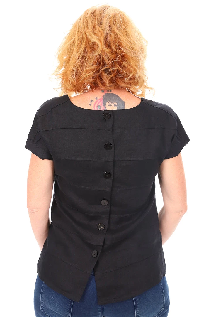 See Saw delivers on stylish linen like no other brand. At Pizazz Boutique we love our See Saw linens. This top is sweet and delivers on a great top which is perfect for under a jacket or on its own. The See Saw top has bust darts and buttons up the back adding some extra detail and has pleated detail sections through the back. Wear this top with the Sew Saw Linen 7/8th pants in the matching black or contrasting white or olive. Add a contrasting leather slide and you are set with a cool look for mid season.Â
