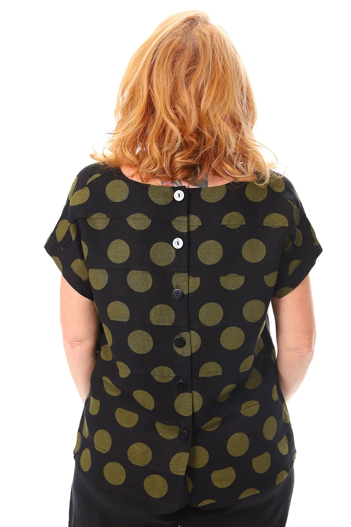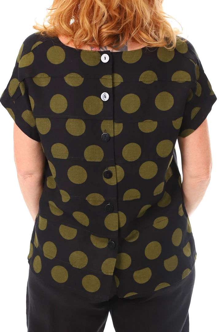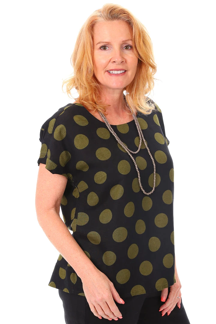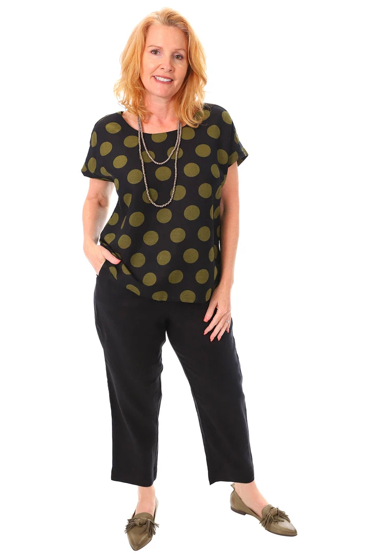 See Saw delivers on stylish linen like no other brand. At Pizazz Boutique we love our See Saw linens. This top is sweet and delivers on a great top which is perfect for under a jacket or on its own. The See Saw top has bust darts and buttons up the back adding some extra detail and has pleated detail sections through the back. Wear this olive spotted top with a black linen pant or team it with the Sew Saw Linen 7/8th pants in the matching olive. Add a contrasting leather slide and you are set with a cool look for mid season.Â