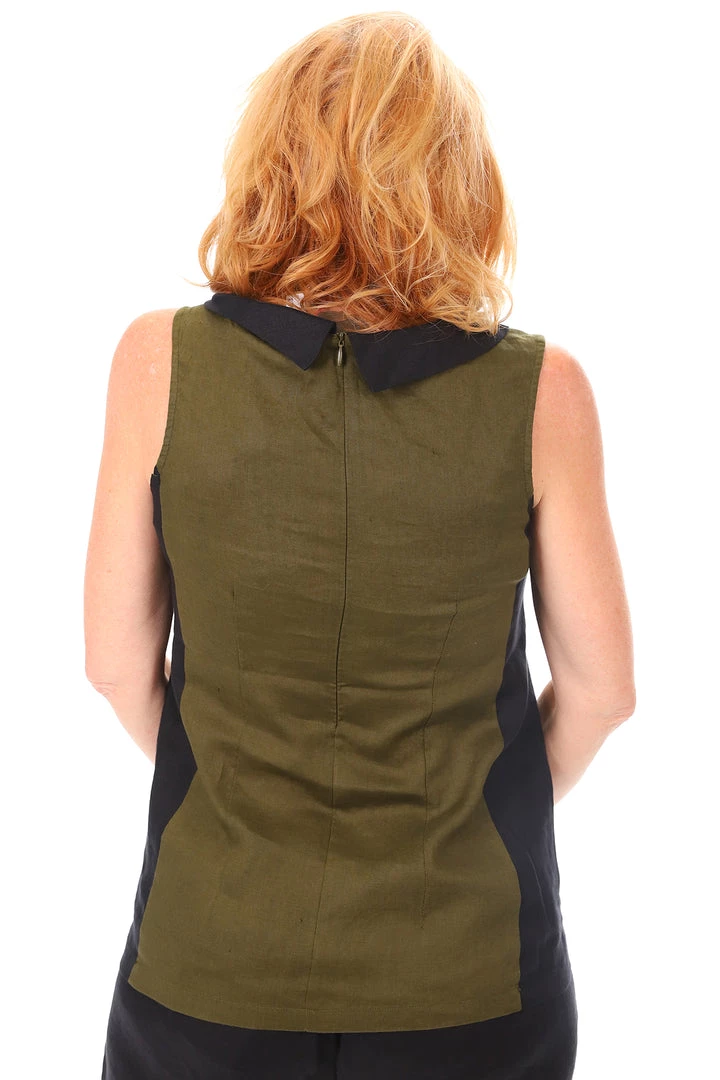 See Saw offers a great designer look in this contrast linen top in black and olive with a elegant reverse collar and zip back. The top is fitted with gentle bust darts to make you look great. Team this with a pair of See Saw’s matching 7/8 linen pants in either olive or black – get both pairs of pants and you have two great looks without even having to think about what to match this great sleeveless top with.Â