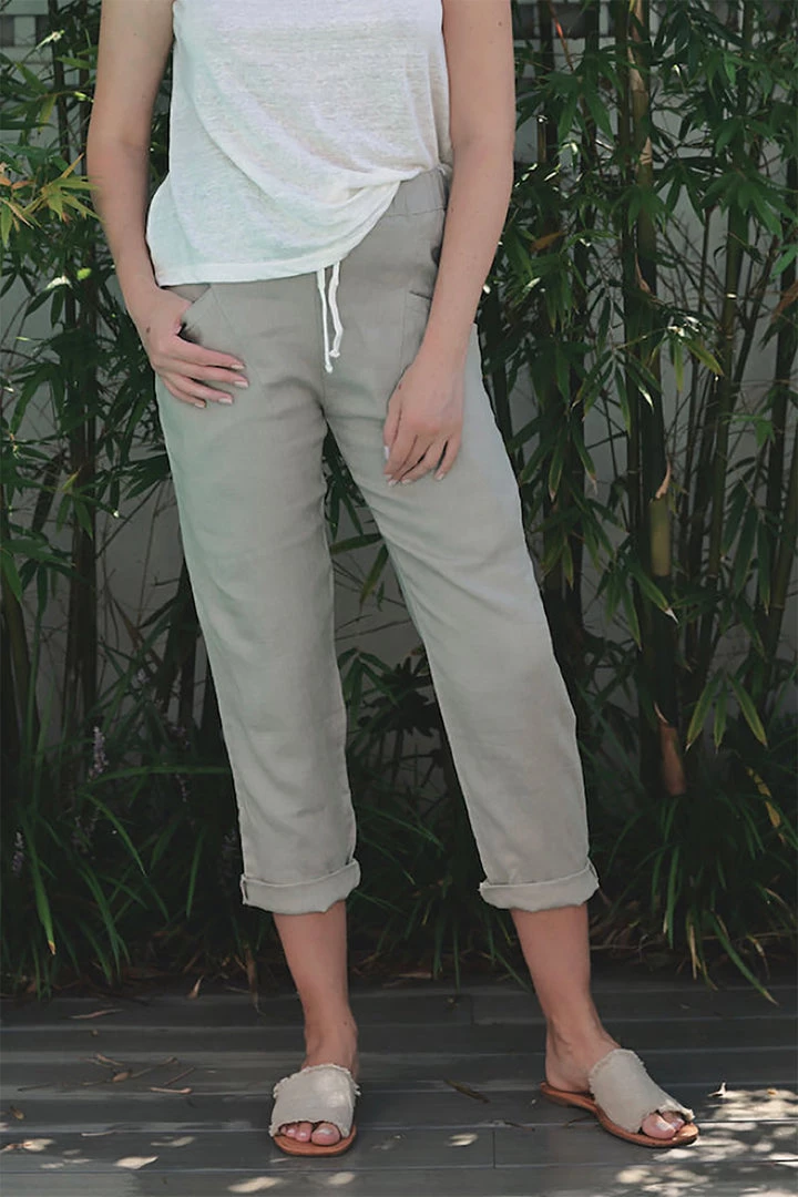 We love linen! Classic linen pieces are wardrobe staples for every season. These linen pants are a great basic. The flat elastic waist with drawstring tie make these pants a great flattering fit. The deep roomy pockets are a convenient feature. Wear them long in winter or roll the hems up for a 7/8th look in the warmer months. Wear these linen pants with a contrasting linen top and a great leather flat for a smart casual look that is timeless.