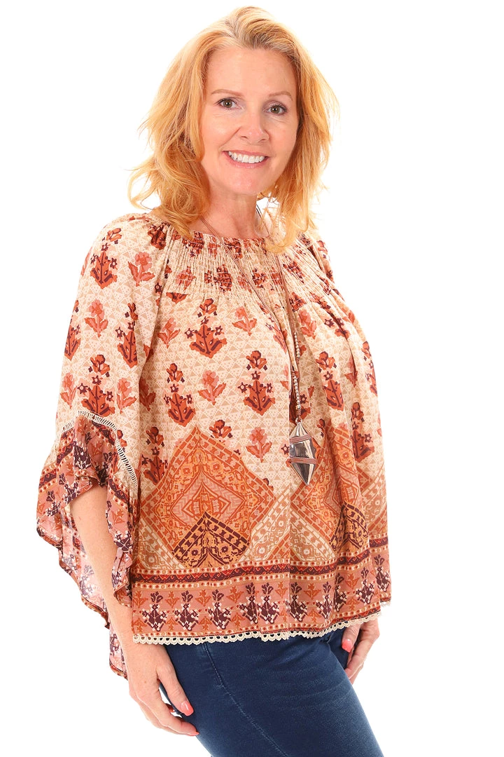 Looking for a great boho top in this seasons winter fashion colours? The Summer Desert Gypsy Top is the perfect addition to your winter wardrobe. It looks great paired with denim or linen pants and will take you to any casual outing in perfect style. The off the shoulder top with 3/4 length sleeves is a lovely loose flowing top. Dress it up with your favourite denims and tan long boots.