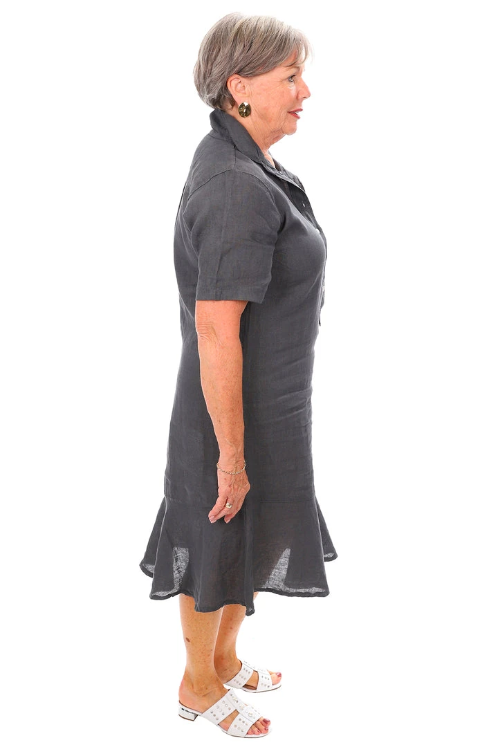 The elegant A-line collared Erin Linen Dress is a staple for every wardrobe. The natural fibres are cool and comfortable to wear and the elegant design with its gentle frilled hemline lifts this linen dress from everyday to special. Add a necklace to enhance the look and dress it up with a cool pair of wedges for the office or for a coffee date for latte and cake with the girls. The Erin linen dress is perfect no matter what the occasion.Â