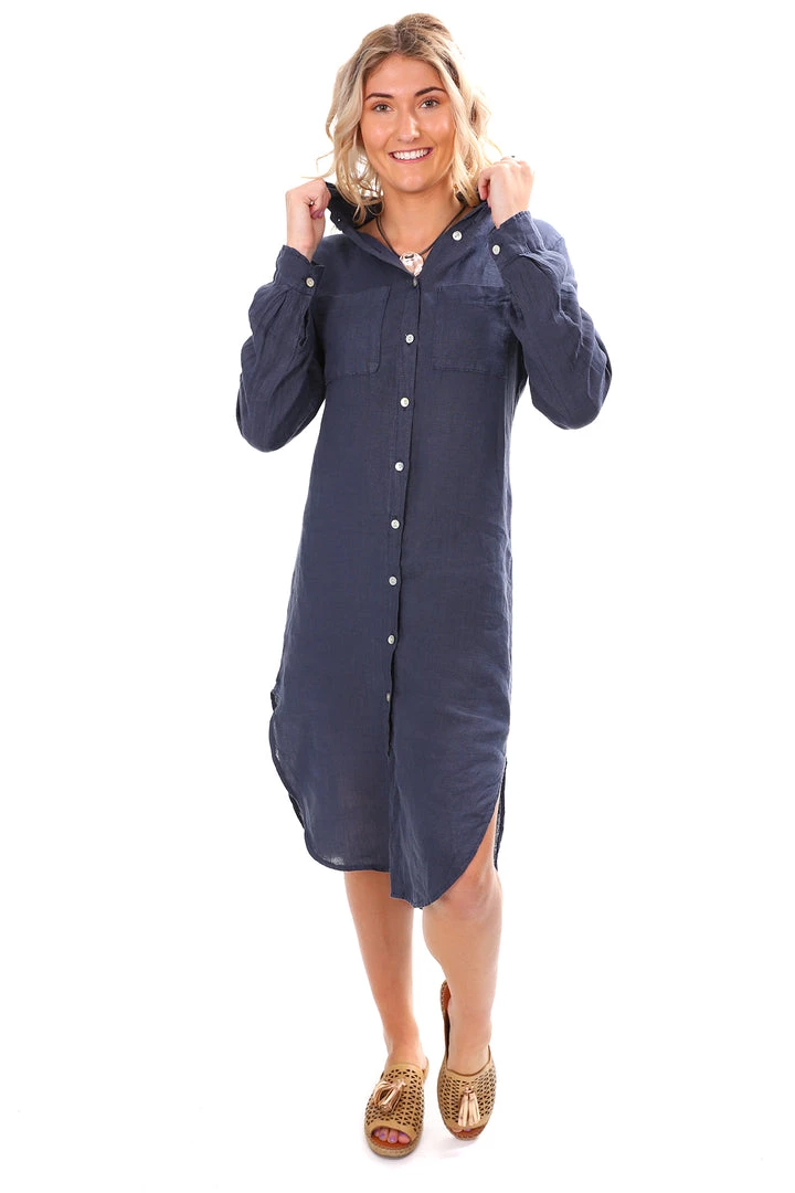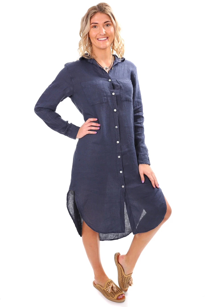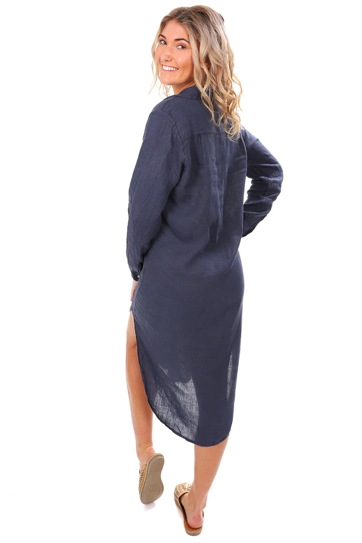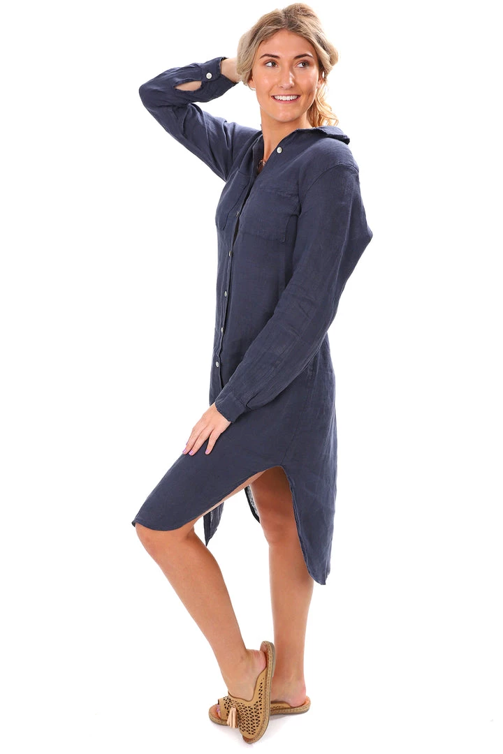 The Sally Linen Dress in Blue is a beautiful addition to your multi-seasonal wardrobe. With an oversized shirt look, this linen t-shirt dress buttons up at the front and completes with a collar. Perfect for coffee dates, cruising and relaxing in!