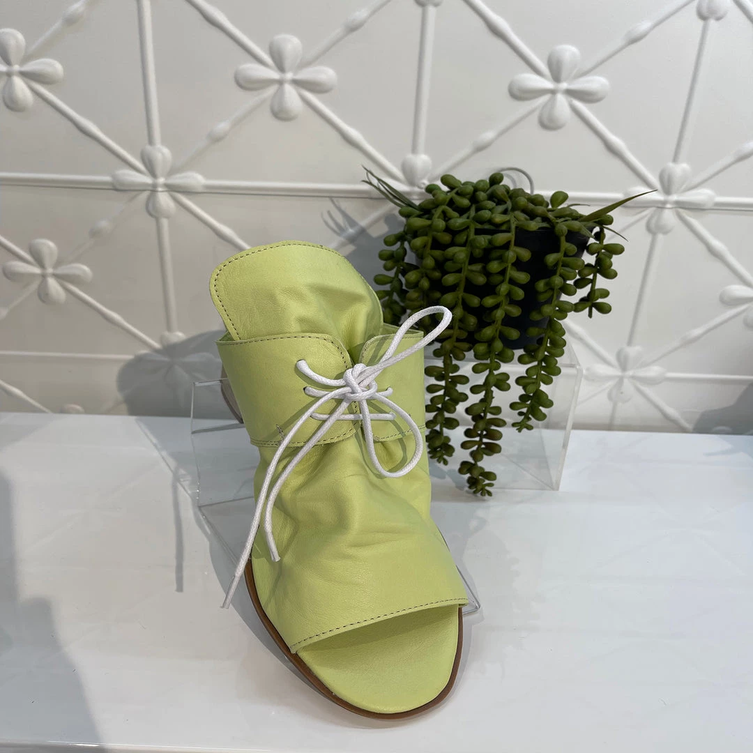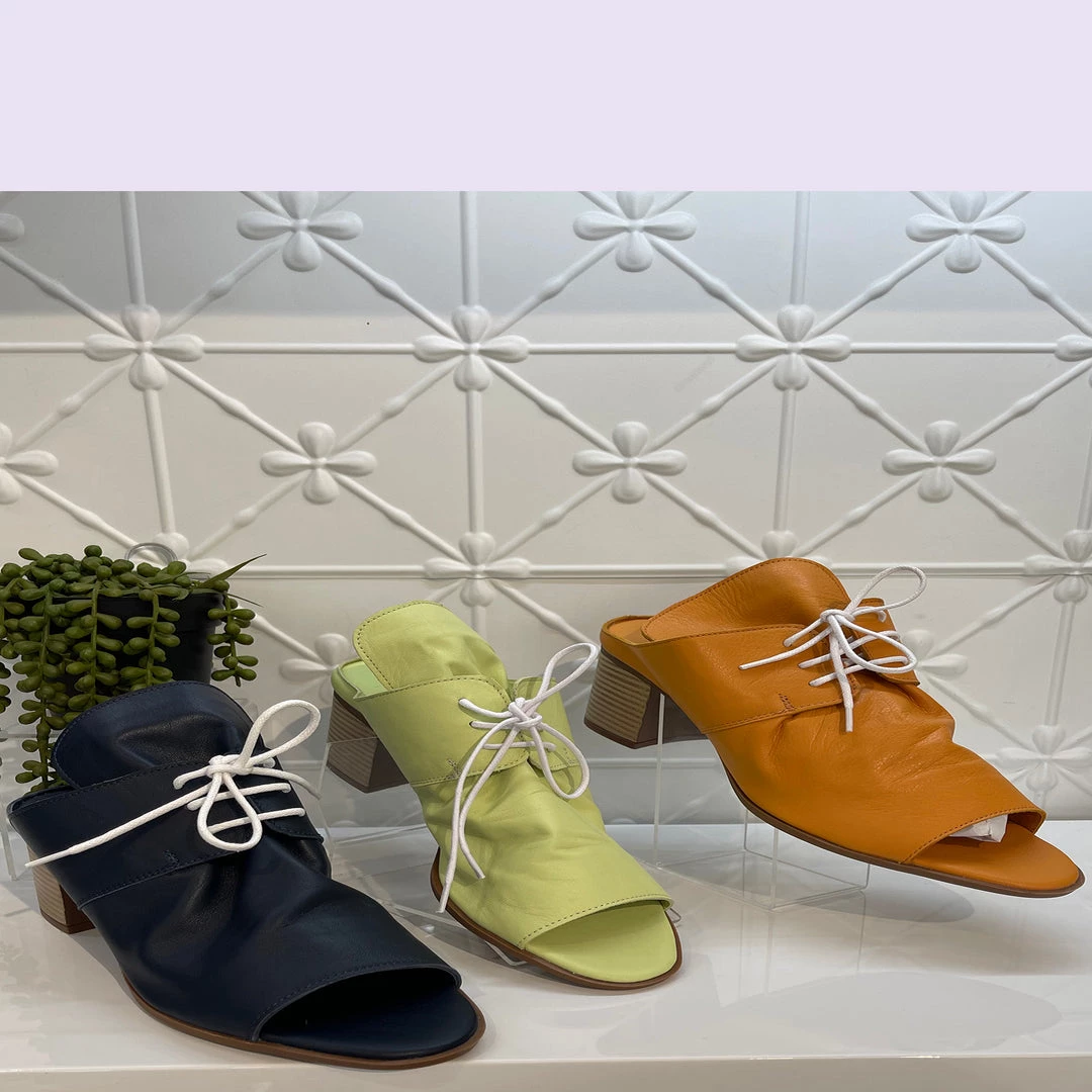 Smart casual summer heels. Slip on with an open toe. The top of the shoe has a lace up detail and covers the top of the foot. They are full leather upper and lining with a man made sole and heel. The heel is 7cm high. Great shoe with pants or jeans. Also available in Orange and Navy
