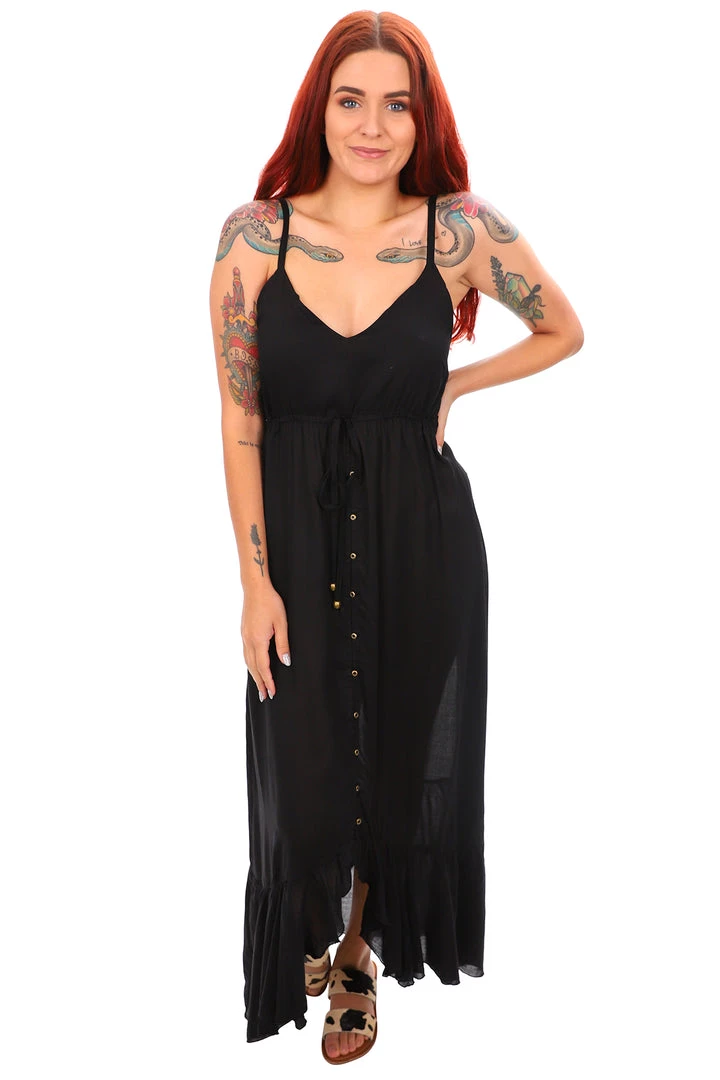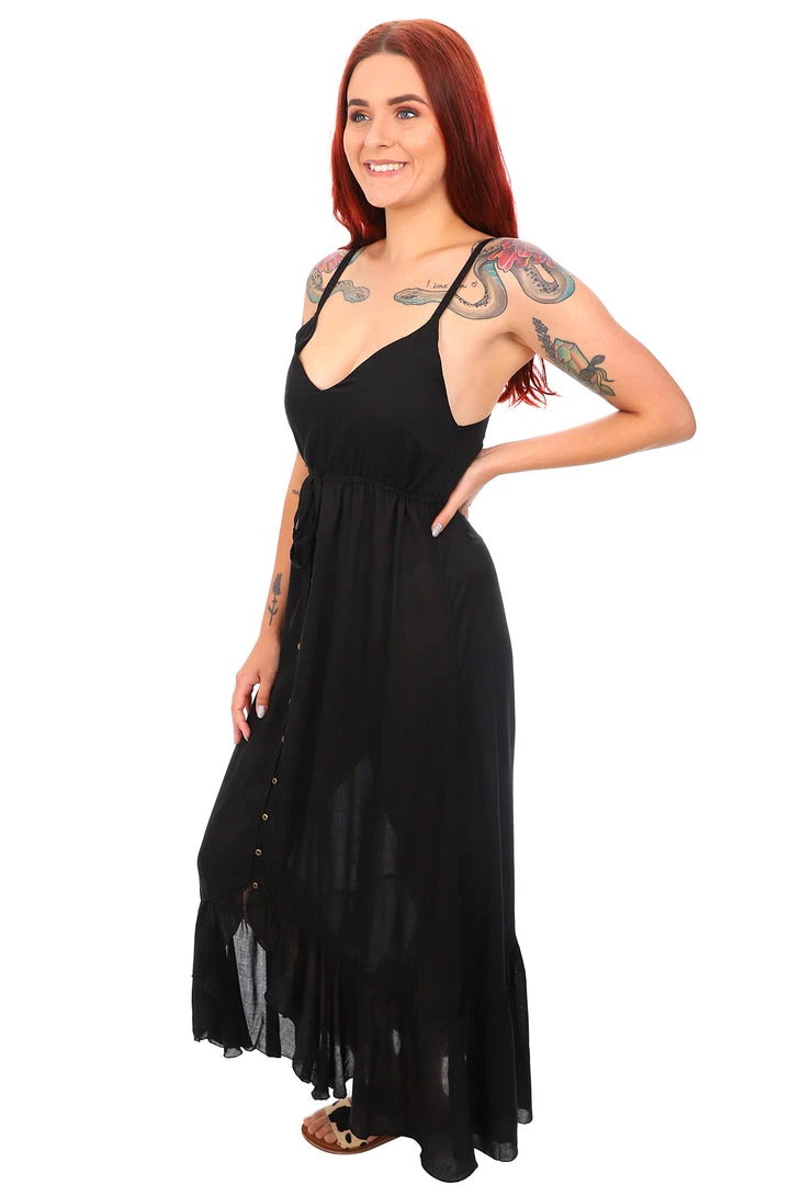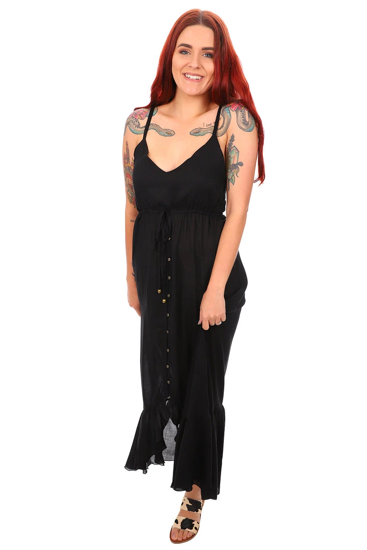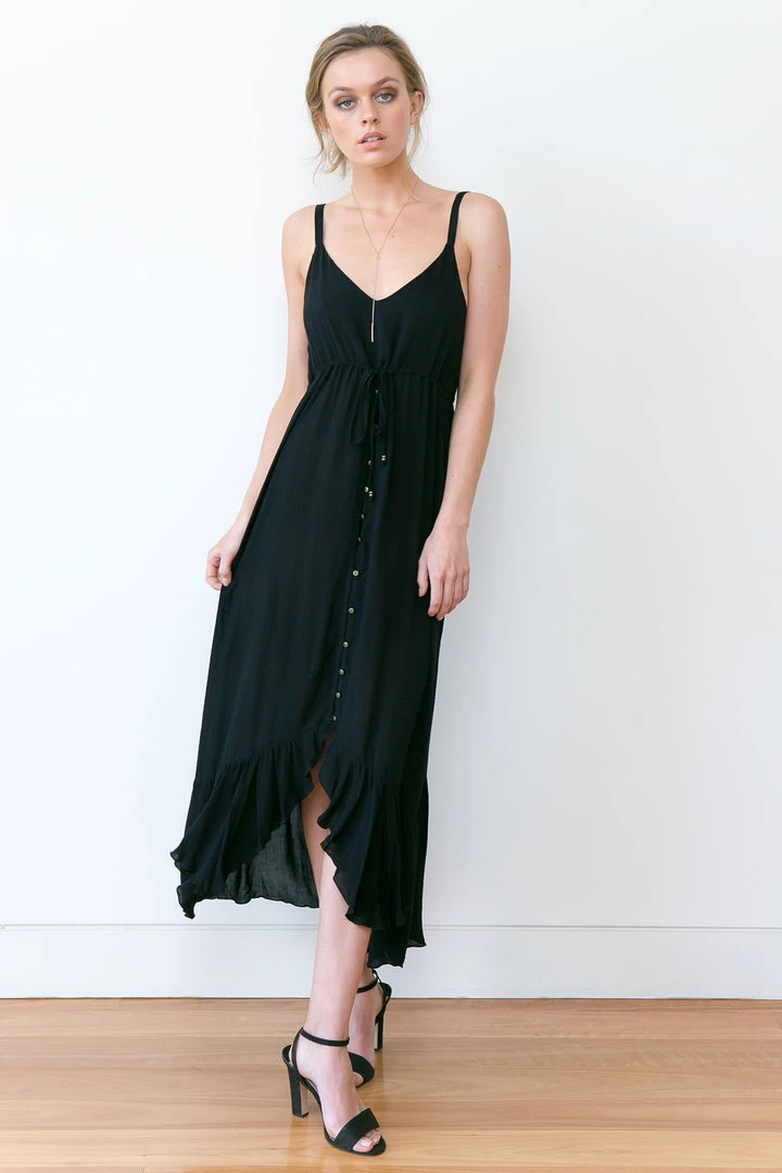 The Chika Tie Maxi in Black by Society the Label is a staple piece in any seasonal wardrobe! With a button feature, tie waist and frill hemline you’ll feel exotic and refreshed no matter the occasion wearing this light weight maxi dress!