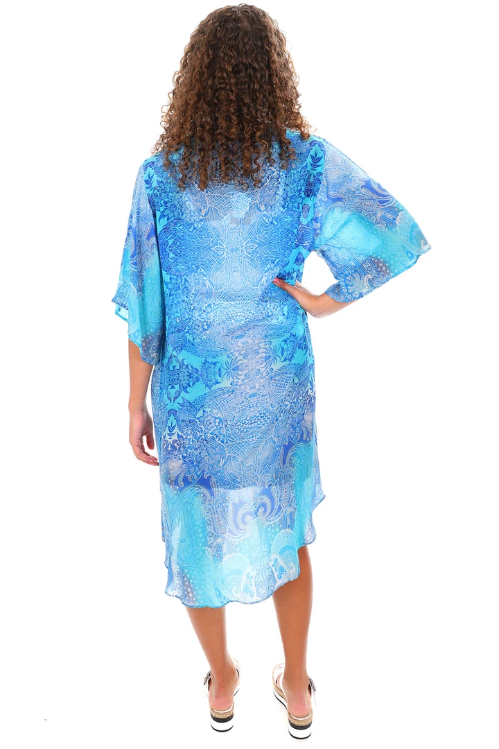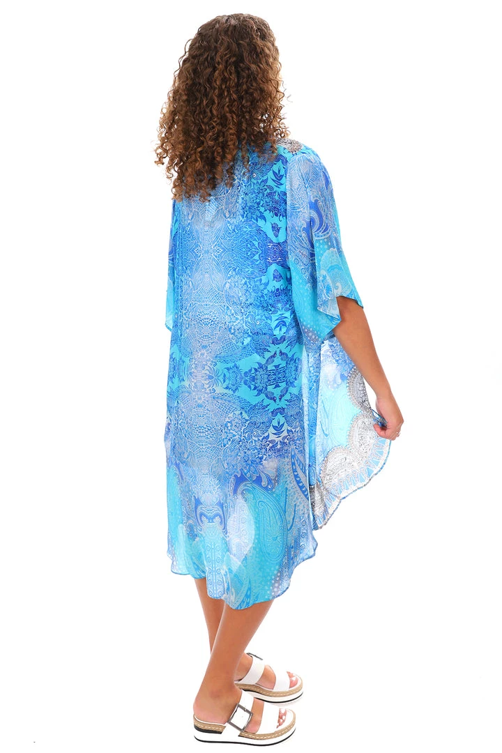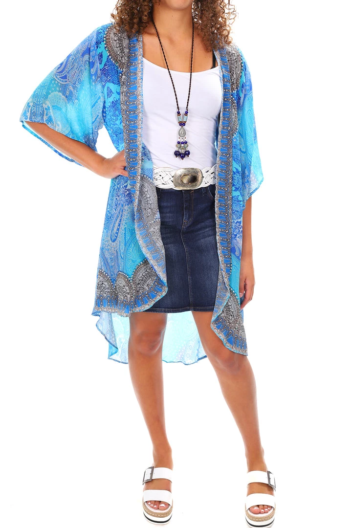 The Blue Chinese Kimono Cape by Solitaire adds a touch of elegance and class to your wardrobe. Wear it over a cami with pants for a look that will make you the envy of your family and friends. Take it to the beach and cover up in true style. The Blue Chinese Cape features jewelled embellishments around the border of the print and offers a touch of style that will make you look and feel perfect for any occasion. This cape is the perfect addition to your travelling wardrobe as it is easy to wear and can create a multitude of outfits all of which will turn heads.
