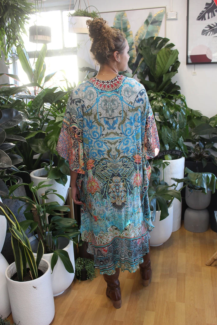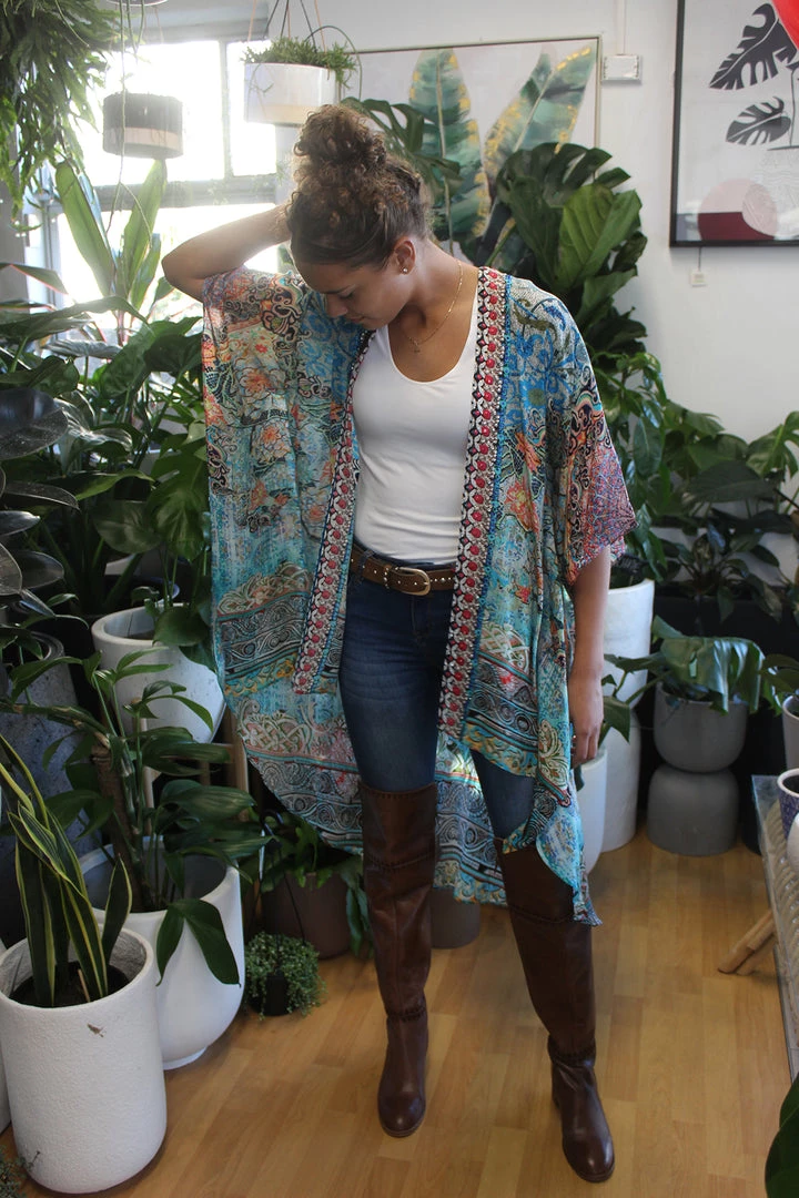 Kimonos are the new coverup which offers elegance and style. This Kimono features delicate diamante embellishments and an edge to edge finish. Toss it over your swimmers at the beach for a stylish look that will protect you from the hash sun or wear it over a simple outfit to create a statement that says style. The dramatic print features a range of colours that you can accessorise with to create a multitude of looks from one great look. This kimono by Solitaire is perfect for holidays and resort stays and is also perfect for BBQ’s with family and friends or a night out sipping cocktails with the girls.
