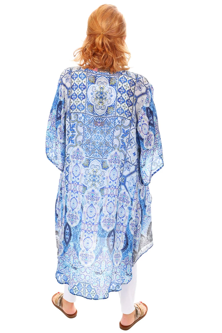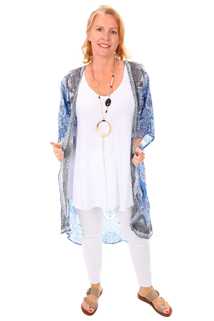 Kimono’s are the new must have accessory for every woman’s wardrobe. Solitaire’s ocean Tile Kimono offers cool comfort and a dash of style. The kimono features delicate diamante embellishments as well as a soft silky feel. Your friends will all be asking where did you get that? Don’t keep it a secret – let them know that you have your Pizazz on!