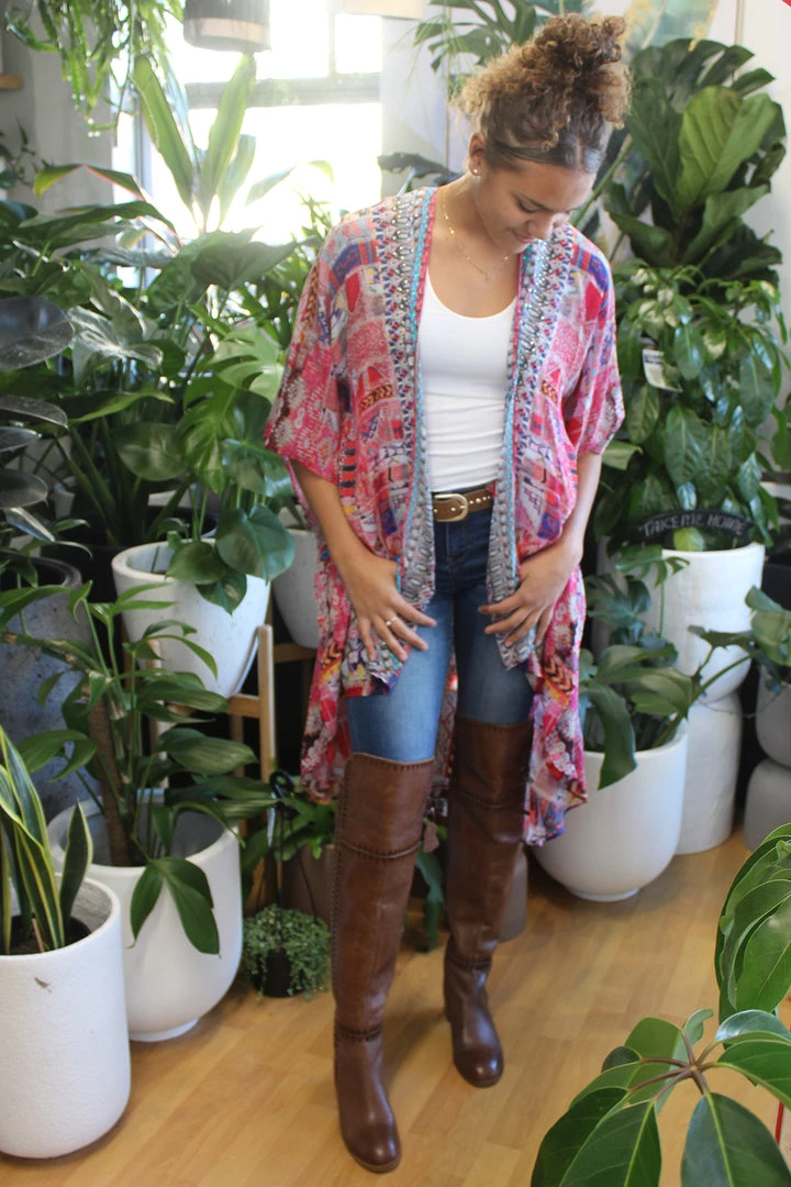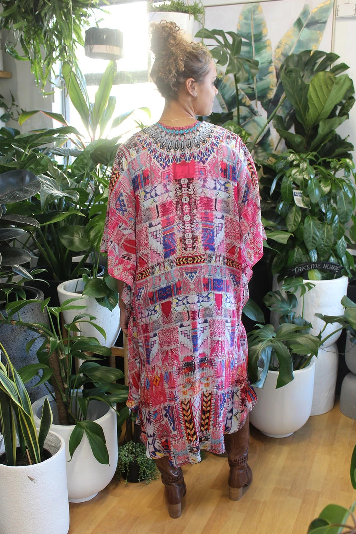 Shades Of Pink High Low Kimono Cape by Solitaire adds a touch of elegance and class to your wardrobe. Wear it over a cami with pants for a look that will make you the envy of your family and friends. Take it to the beach and cover up in true style. The Blue Chinese Cape features jewelled embellishments around the border of the print and offers a touch of style that will make you look and feel perfect for any occasion. This cape is the perfect addition to your travelling wardrobe as it is easy to wear and can create a multitude of outfits all of which will turn heads.