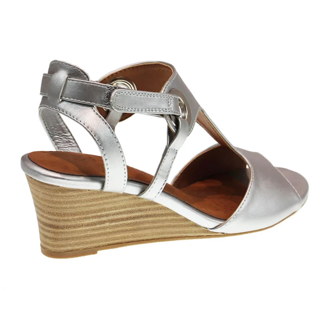 This Silver wedge from Step on Air features a T-Strap style with hook and loop detailing that adds to this sophisticated look of this wedge and with the padded footbed offering you contoured support this is a shoe that will comfort your foot all day long.