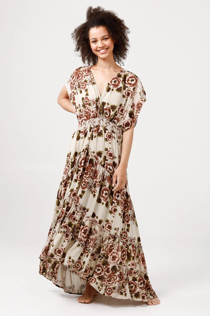 The stars will align for you when you slip into the Zodiac Dress in Malicon Sage by Talisman! Made from a breathtaking floral viscose fabric this boho maxi dress is bold and unforgettable. The V neckline, elastic waistline, wide sleeves and earthy tones work together to create a whole aura around you! Perfect for any and all occasions!