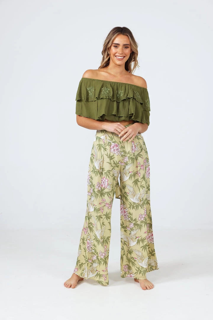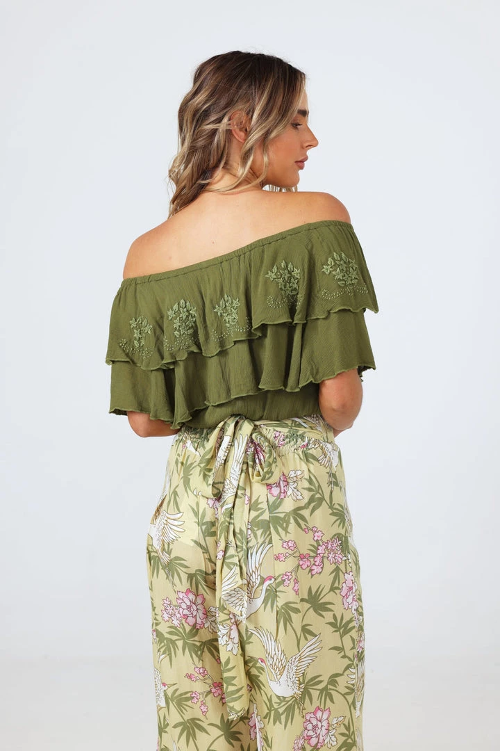 Glow differently this season wearing the Road Trip Top in Olive green by the daring Talisman. Taking a unique top and giving it life through a bold print, this crop top is both fierce and feminine. The off shoulder neckline is elasticated, keeping it in place comfortably. With a flounce hemline and sleeve this bold summer top is a must have for your wardrobe this season!