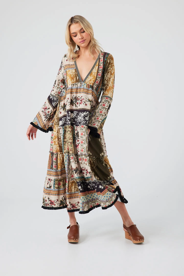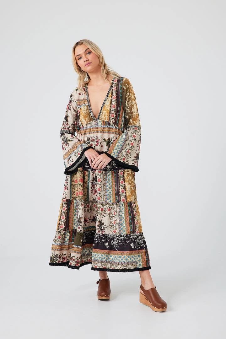 The Zelda Dress is a vision to behold. With her plunging neckline and show-stopping details, she’s sure to leave you spellbound! Complete with a bell sleeve, tiered skirt and magical print, Zelda is made for a bohemian goddess.  Pair her with a chunky mule shoe, or a classy heel for a night time look.Â