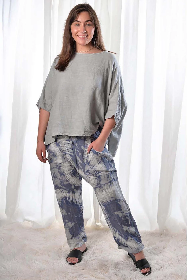 Looking for a soft and comfortable pant for lounging – look no further -these linen pants by Italian Cartel just like wearing your PJ’s but you can go out in them too! The pants feature a great tie dyed look and have a soft comfort fit wide elastic waistband which measures 96cm. These pants are great for around the house lounging but can be dressed up with a chunky necklace and a contrasting linen top and leather slides.