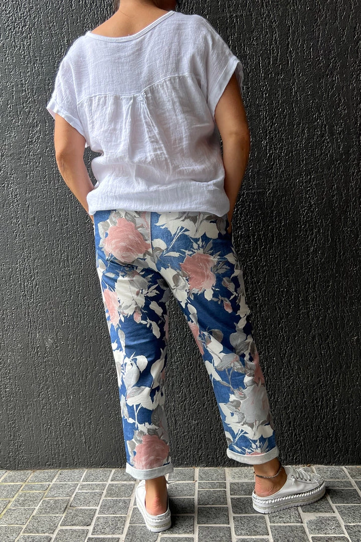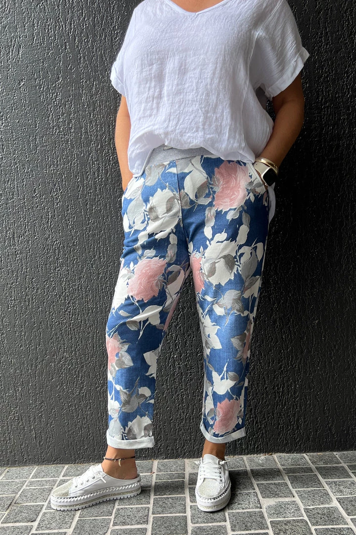 Want a feminine look that is on trend try these Angie Floral Pants in Denim by The Italian Cartel! The Denim inspired colour with its refreshing floral print is delivered in a pant that is versatile and comfortable. The cropped leg and drawstring waist add a touch of Pizazz to your life and create a complete look when paired with a relaxed linen top.