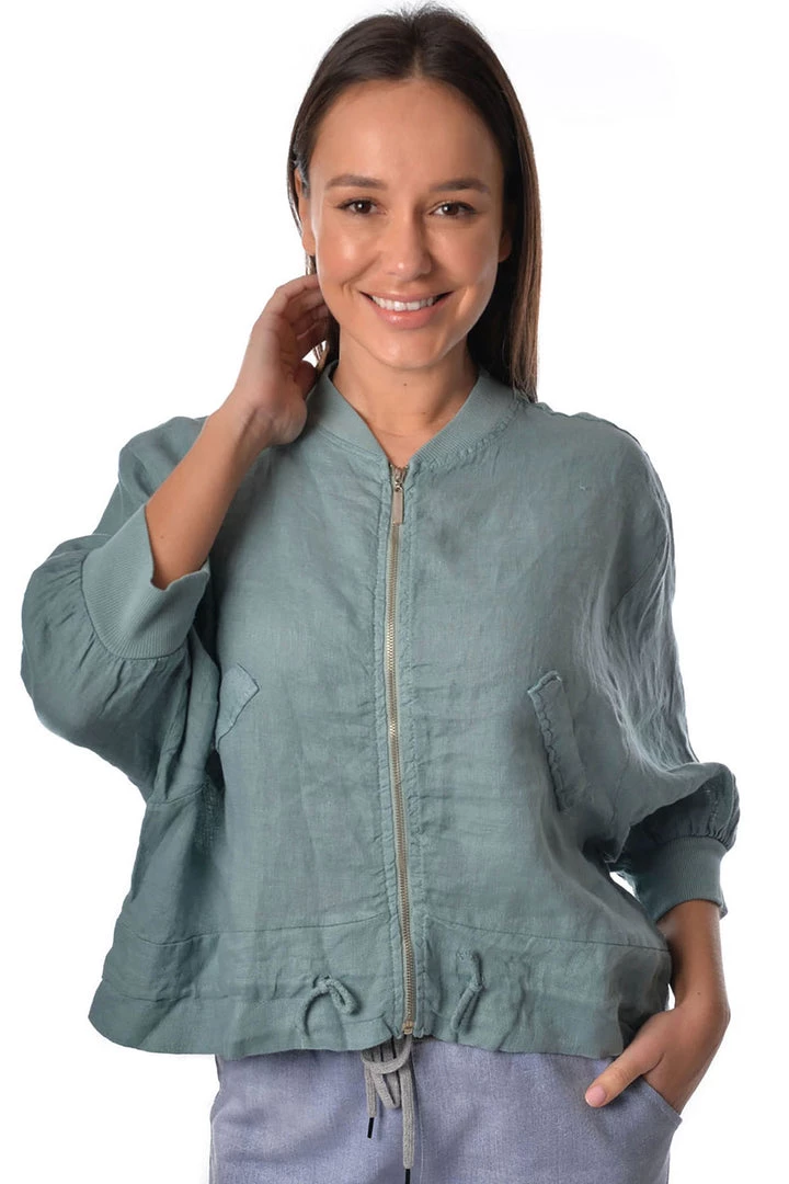 The Cori Linen Jacket in Sea Breeze by The Italian Cartel is a feminine and funky piece to add to your collection. Radiating a beautiful boho feel, this Italian made jacket zips up and has an elastic cuff allowing you to wear this piece any way you want. Â