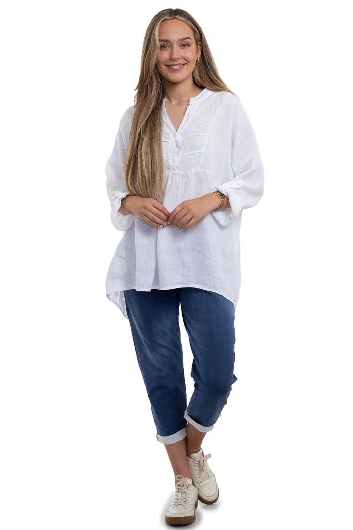 The Krista top in white linen is a must have this season, this beautiful Krista top has a V-Neckline, Pleated pattern across the chest with two functional buttons & a full length sleeve that can be rolled up with a button support.. The Krista Top is just a versatile top that all us pizazz girls love; it will go though season after season. Â