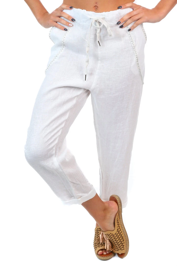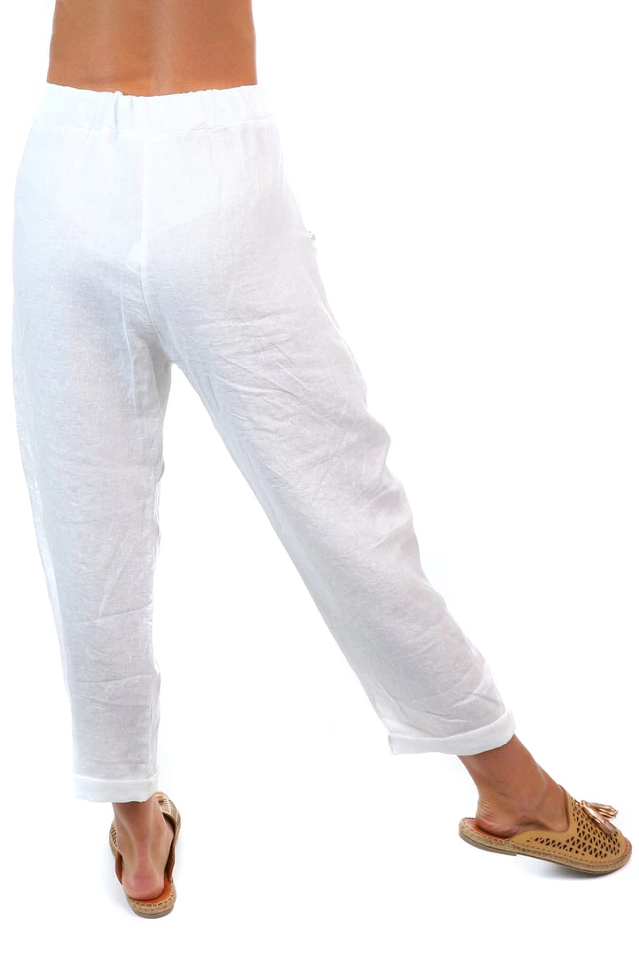 Add some classics to your wardrobe this season with the linen Messina Pant by The Italian Cartel! The crisp white is refreshing and versatile keeping you warm in the chilly weather! The cropped leg and drawstring waist add a touch of Pizazz to your life and create a complete look when paired with a relaxed linen top.