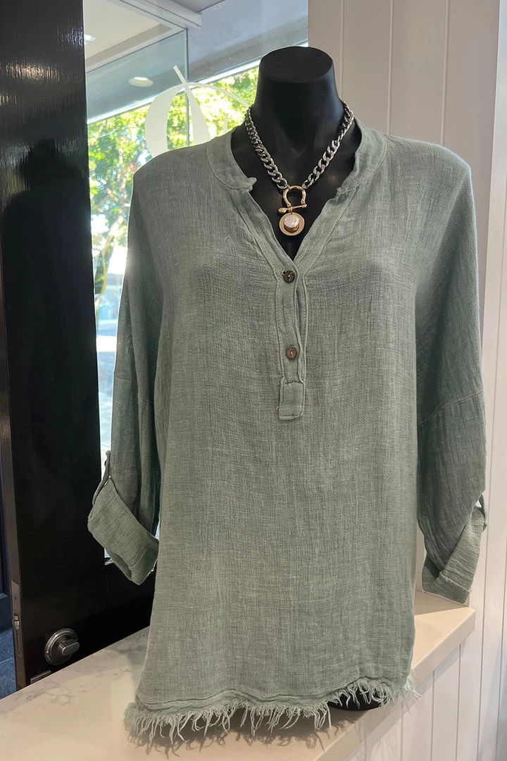 This 3/4 Rolled sleeve linen cotton Sally Top in Sage , can be dressed up with our Gorgeous pants or favourite denim jeans. With a button detail v neck and frayed hemline, it can be a staple in your wardrobe.