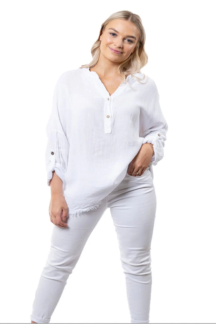 This 3/4 Rolled sleeve linen cotton Sally Top in White, can be dressed up with our Gorgeous pants or favourite denim jeans. With a button detail v neck and frayed hemline, it can be a staple in your wardrobe.