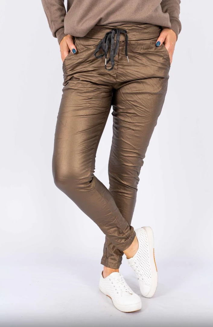 They’re here The Daosta pleather pant has arrived at pizazz, the super comfy catwalk style pant is a winner, this Daosta pant is a must have for all ladies, with a thick pull on band around your waist taper shape legs you will loves these beauties.