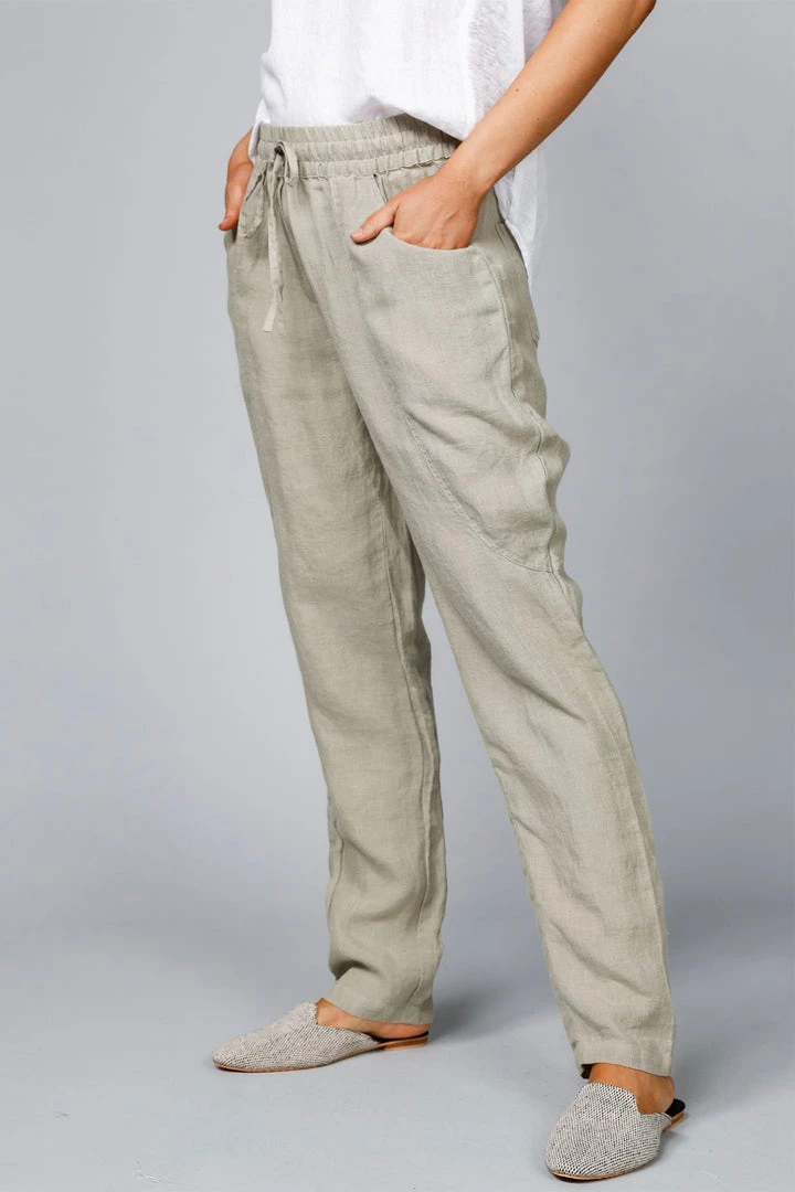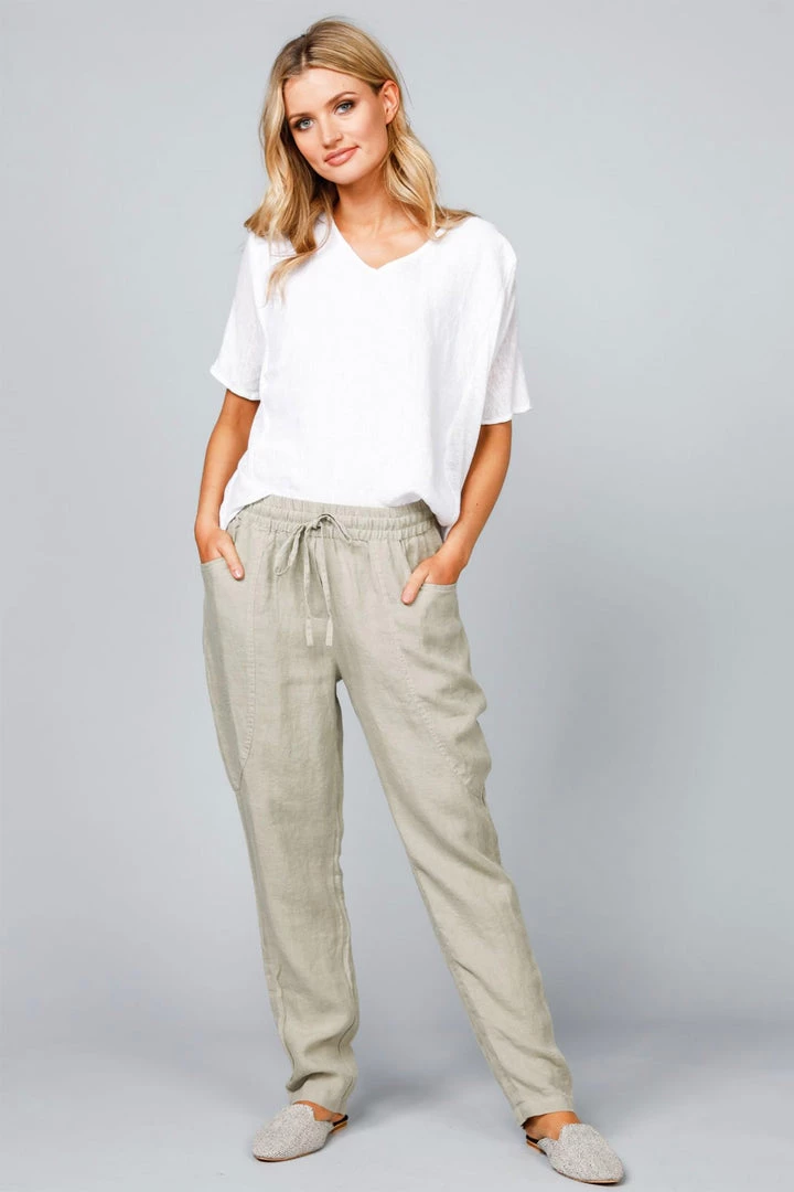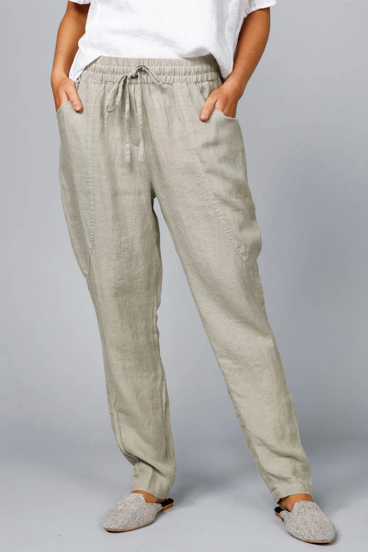 The Amalfi Pants in Tea by The Shanty Corporation are a super light weight natural linen pant featuring a drawstring waist and loads of Pizazz. With generous pockets and a comfortable tapered leg this summer basic is comfortable, practical and full of style. Add a sandal and an ice coffee to create the ultimate Summer look this season!