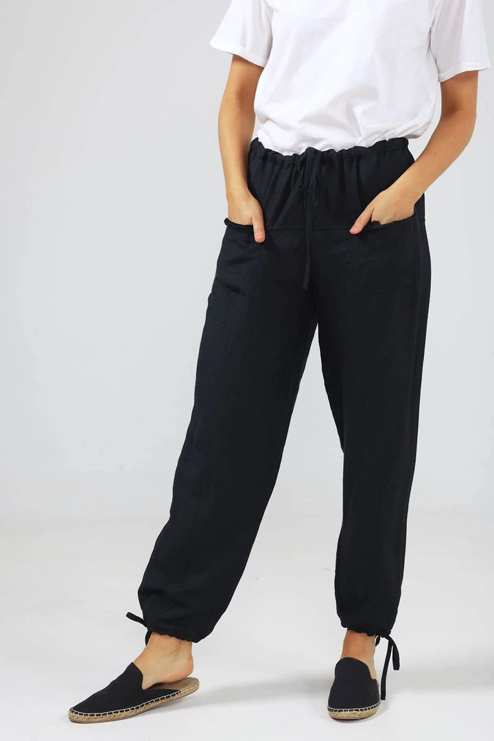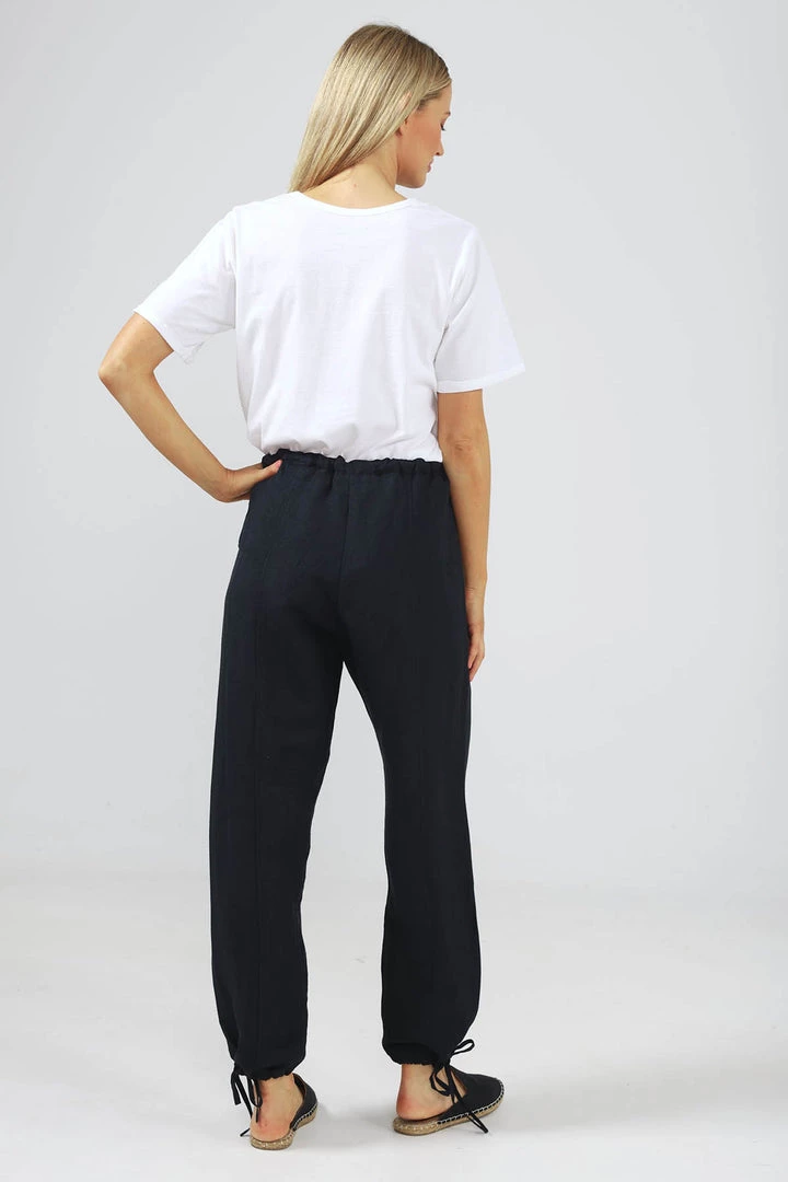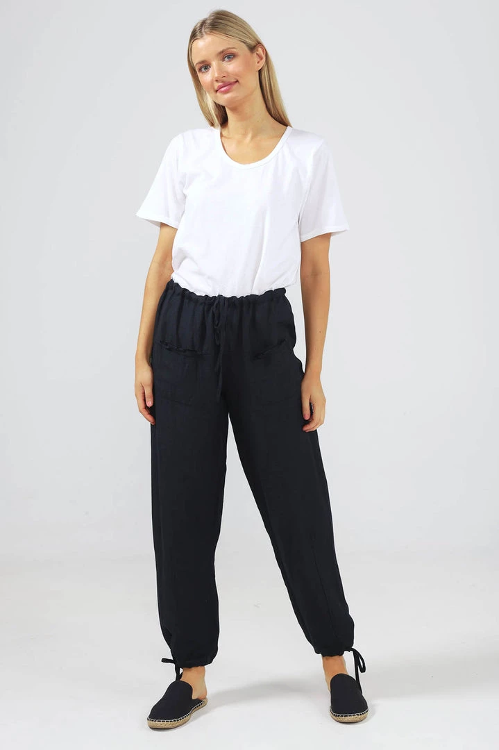 Casual afternoon picnic….here you come. These light weight linen pants with tapered leg are perfect. the waist is elastic with drawstring and the drawstring detail is repeated on the cuff. Front pockets with frayed edge are great to show off with a tucked in tee. The back has a centre seam. Also available in Tan, white and natural