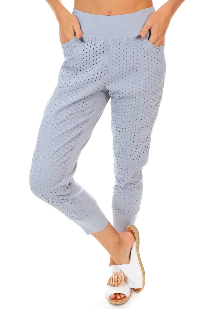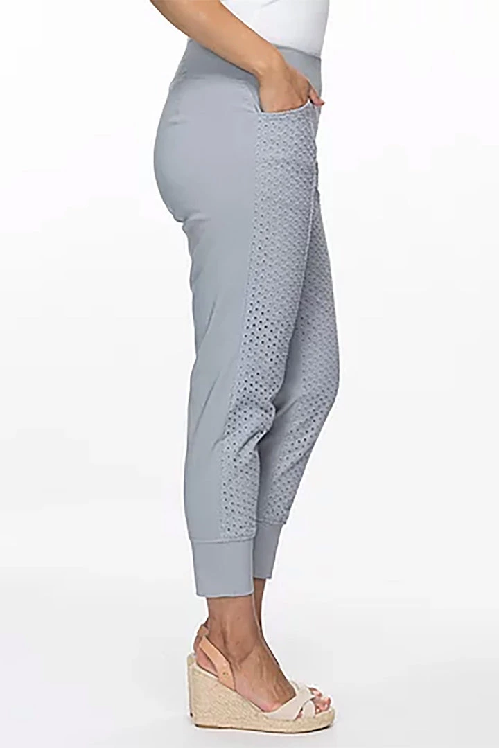Sometimes more is less, and such is the way with these simplistic Basic Lace Front Pants by Threadz. With an elastic waist and cuffs, pockets and a tapered fit these silver grey pants are simple to wear and match with everything you’ve already got. The feminine lace on the front of these Threadz pants add a simple element of design and keep your look modern, adding a touch of Pizazz to these seasonal delights!Â