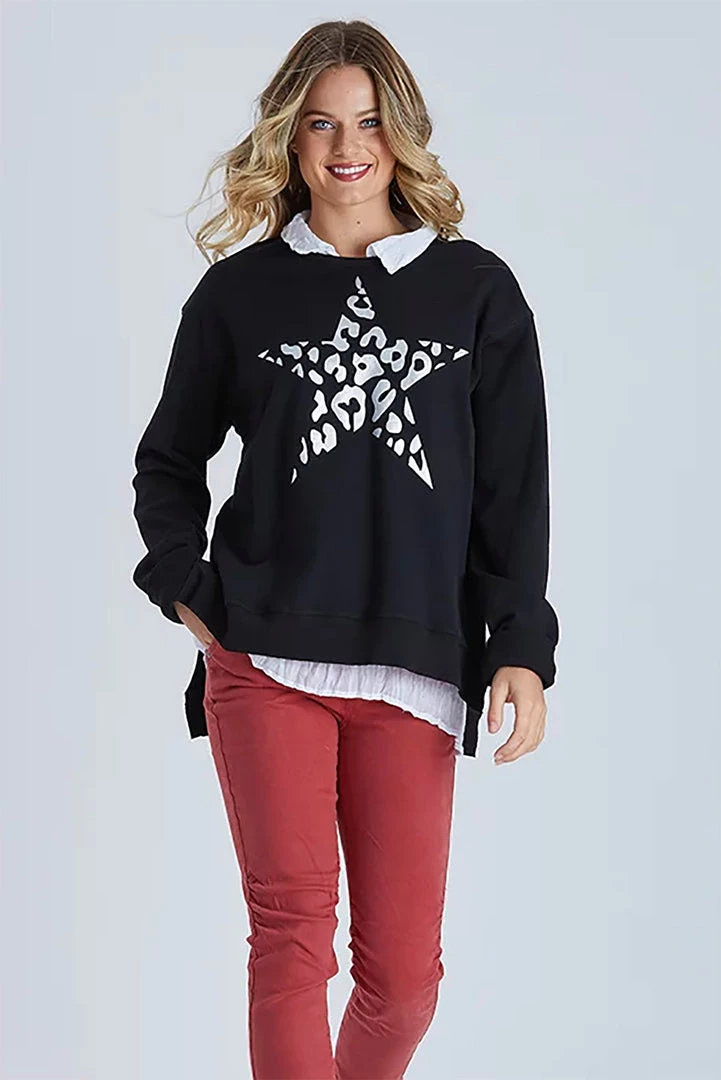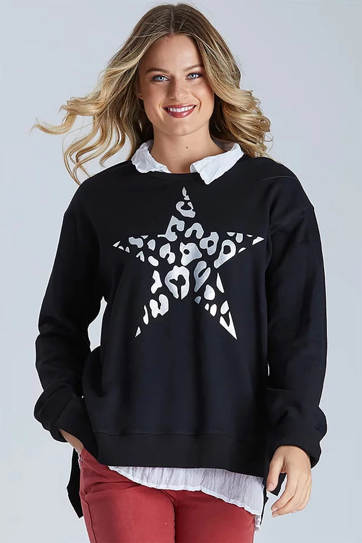 Metallic Printed Star Top with an animal theme – what more could a girl want! This top by Threadz offers this seasons latest fashion trends with a bright silver placement print and the comfort of 100% cotton you can’t go wrong! This top offers great comfort and style for extra flair we have teamed it with a contrasting pant for winter.