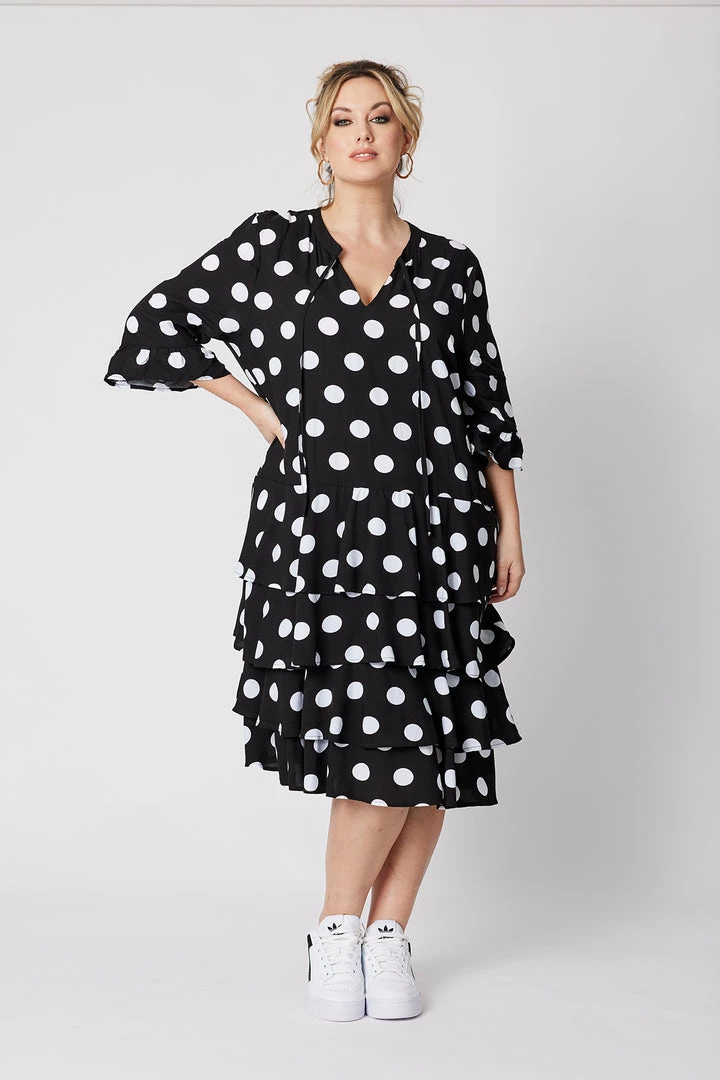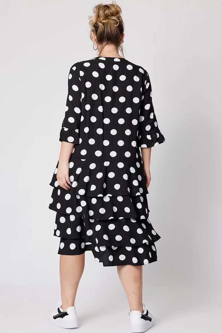 This black spotted dress is a flowy relaxed fitted dress with a ruffled hem, round neckline with center keyhole and a self tie. Pair it together with a contarting sneaker and accessories for a finishing look.