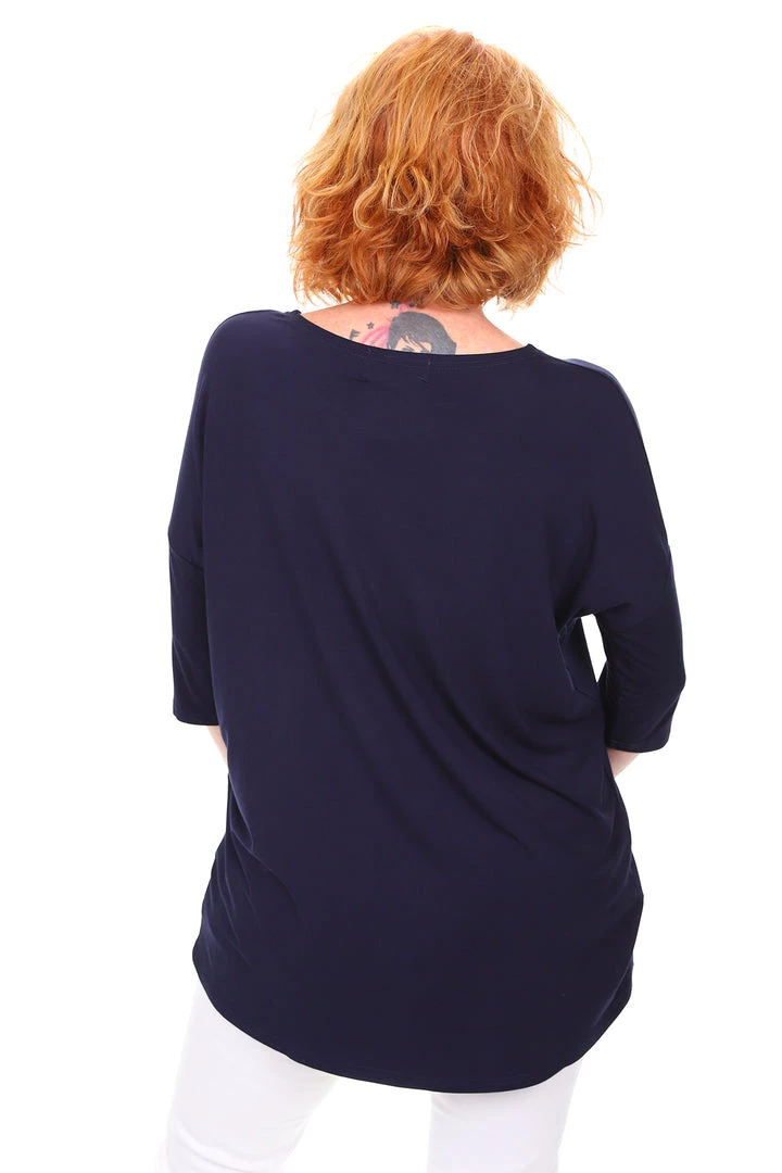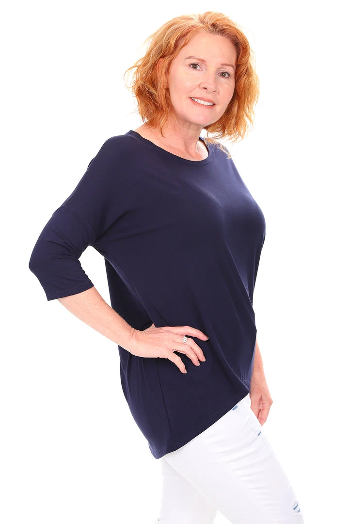 The Relaxed High Lowe Bamboo Top in Navy by Whispers is a light weight, breathable basic to add to your every occasion wardrobe! With a 3/4 sleeve, straight cut, high low hemline and comfortable stretch this navy bamboo top is a must have staple for all days!