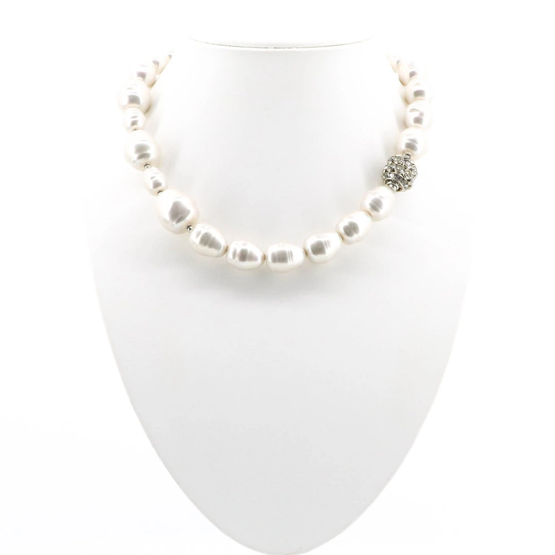 Short pearl necklace that radiates a classic beauty and breaks it up with an off centre diamanté cluster feature bead. Held together by a magnetic clasp.