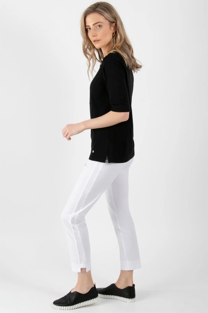 These pull on pants by Verge have a wide concealed elastic waist band which sits well under tops without creating a visible line. They feature a 7/8 leg with detailed side splits more importantly these pants offer comfort with style that you will be happy to wear every day! Team these great pull on pants with a loafer or leather sneaker and a lightweight knit for a great fashion look!