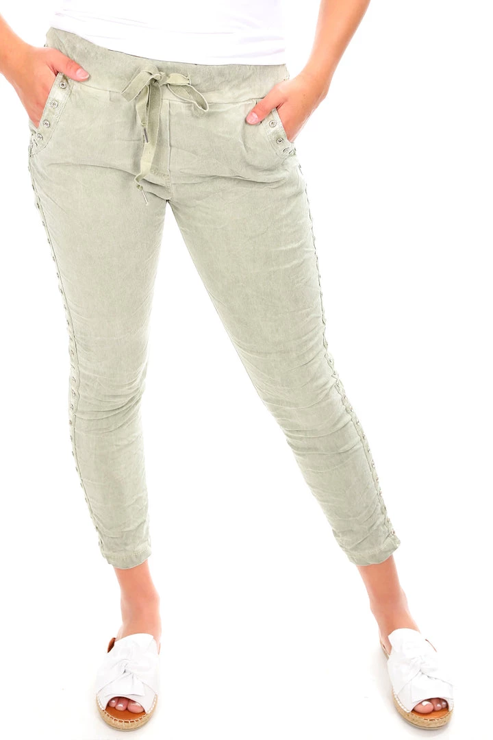Wednesday Lulu are designed in Italy & they offer great European style and comfort. These cotton elastane pull on pants are a wonderful comfort fit with a tie waist and stud detail down the side of leg. These Everyday Pants in Sage are a must have!