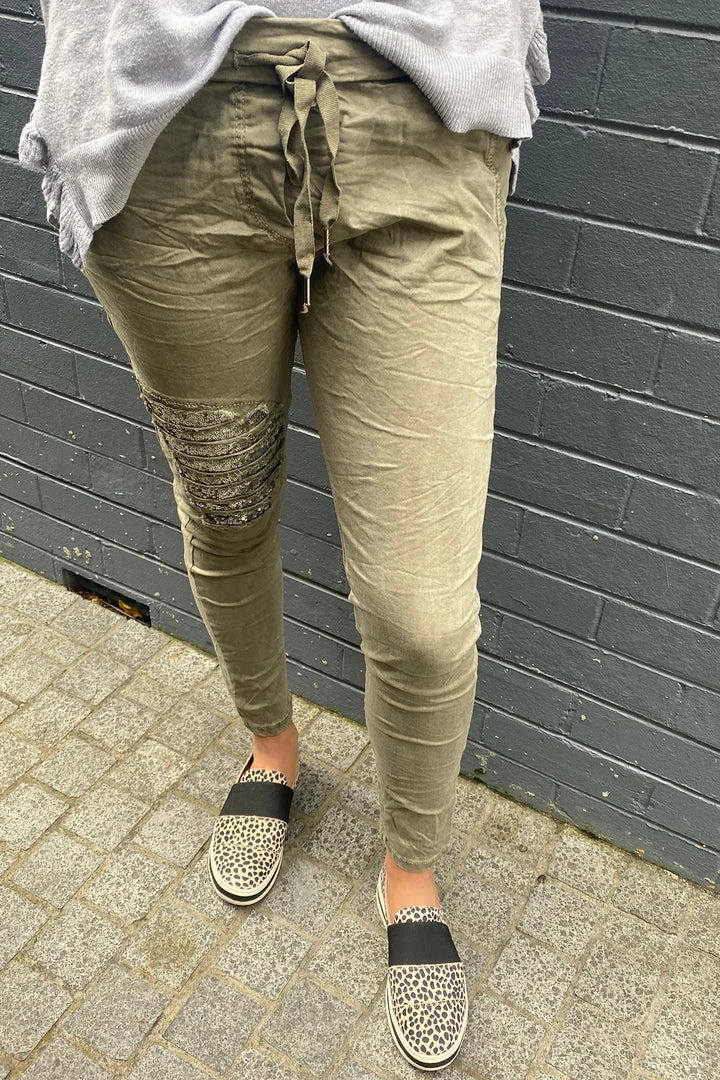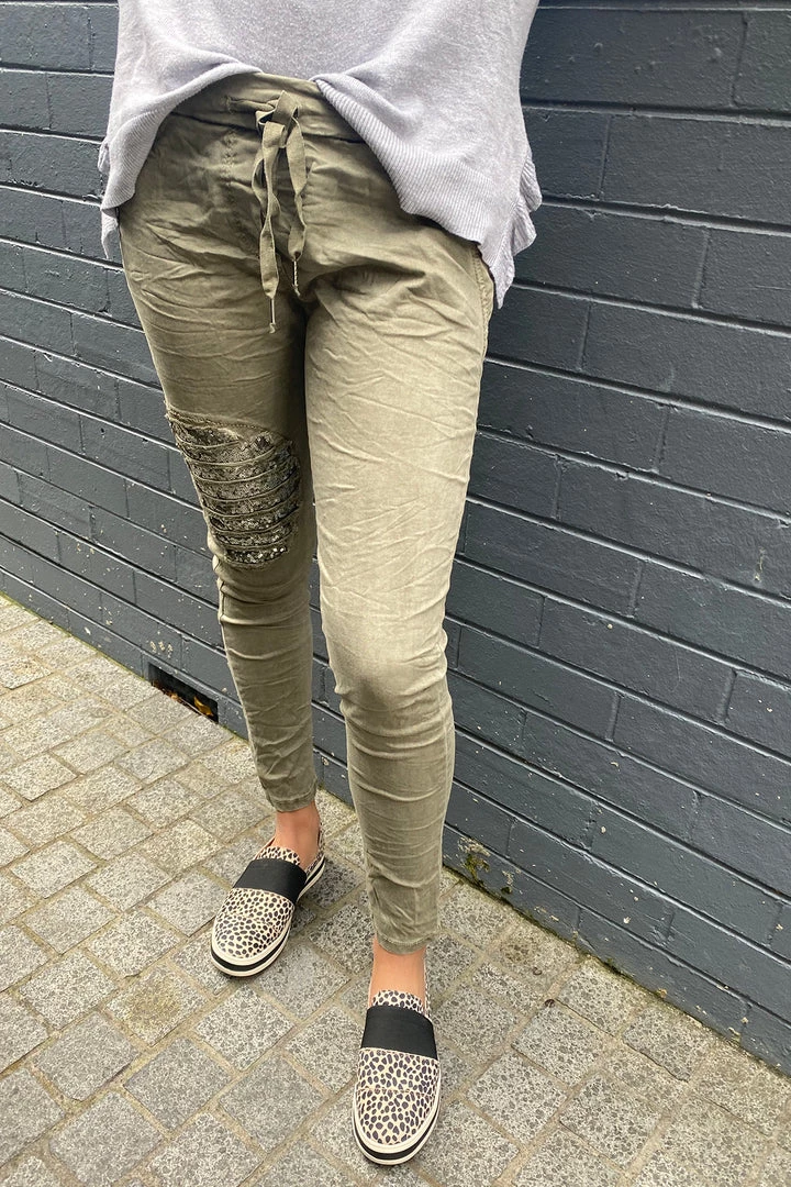 Khaki is the on trend colour for winter 2021! These great sequin trimmed pants in khaki by Wednesday Lulu are a great fashion look and the relaxed fit will have you reaching for these pants whenever you want a great comfort look.