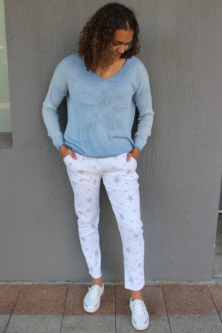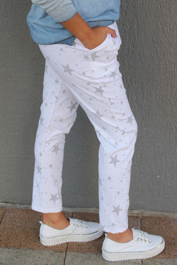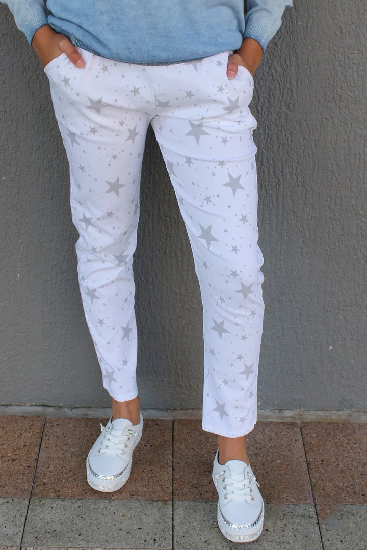 Add someĀ star glamour to your wardrobe this season with theĀ Silver Star Pants in WhiteĀ by Wednesday Lulul! TheĀ galaxy inspired patternĀ is refreshing and versatileĀ keeping you on trend this season! The pull on style and drawstring waistĀ add a touch of Pizazz to your life and create a complete lookĀ when pairedĀ with a relaxed linen top.