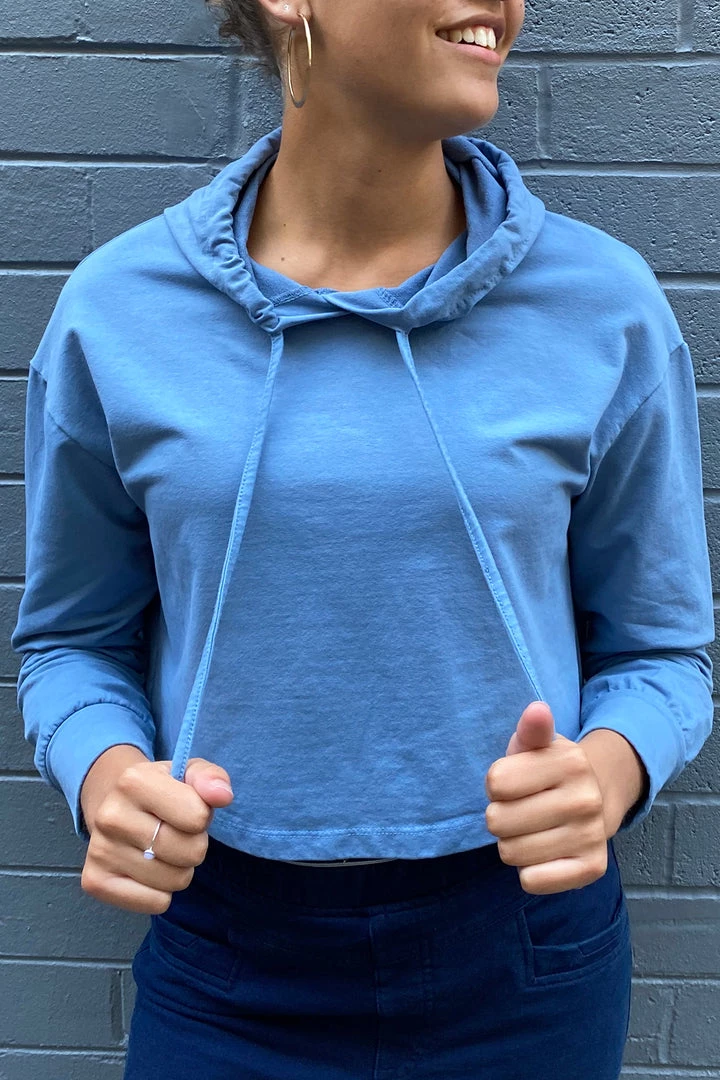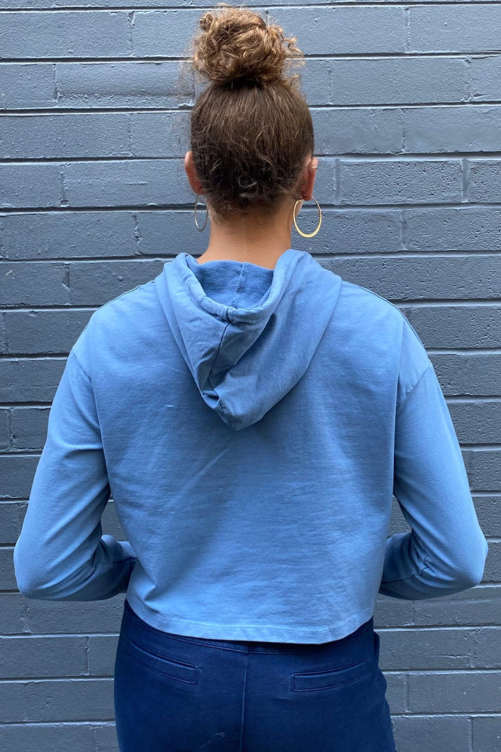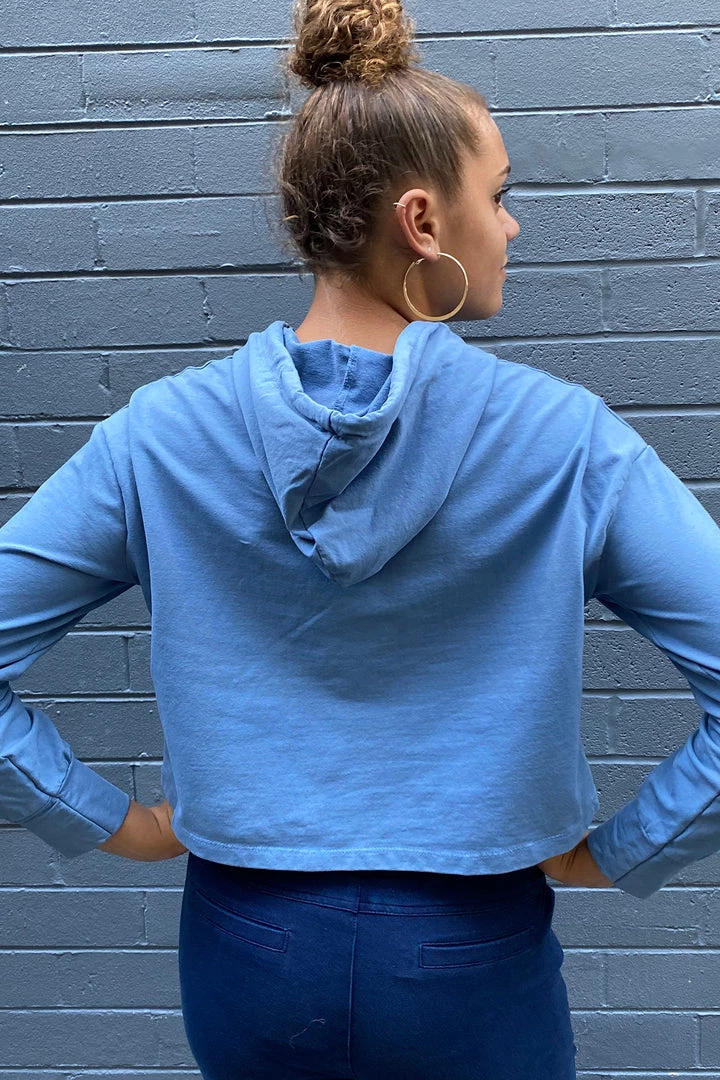 Looking for European style – this cropped hoodie offers just that! The hoodie has a fun cut with a drawstring neckline. The cropped style allows you to show off your booty and the great look that your favourite jeans give you! We teamed the paler blue shade of the hoodie with a dark denim and an ankle boot.