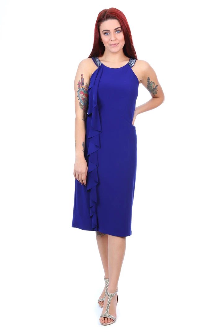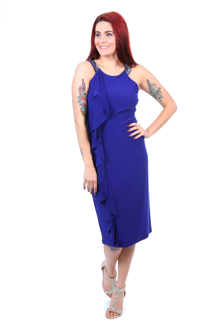 Behold – a cocktail dress more than worthy of drinking cocktails in! This Majesty Blue Zaliea short formal dress is a modern slice of classic design. Designed for real women this embellished neckline, mid length chiffon dress with cut away shoulders and waterfall detail will transform its occasion from mother of the bride to work awards night or a day at the races! With a tapered silhouette and stretch material your day of memory making will look as good as it feels.