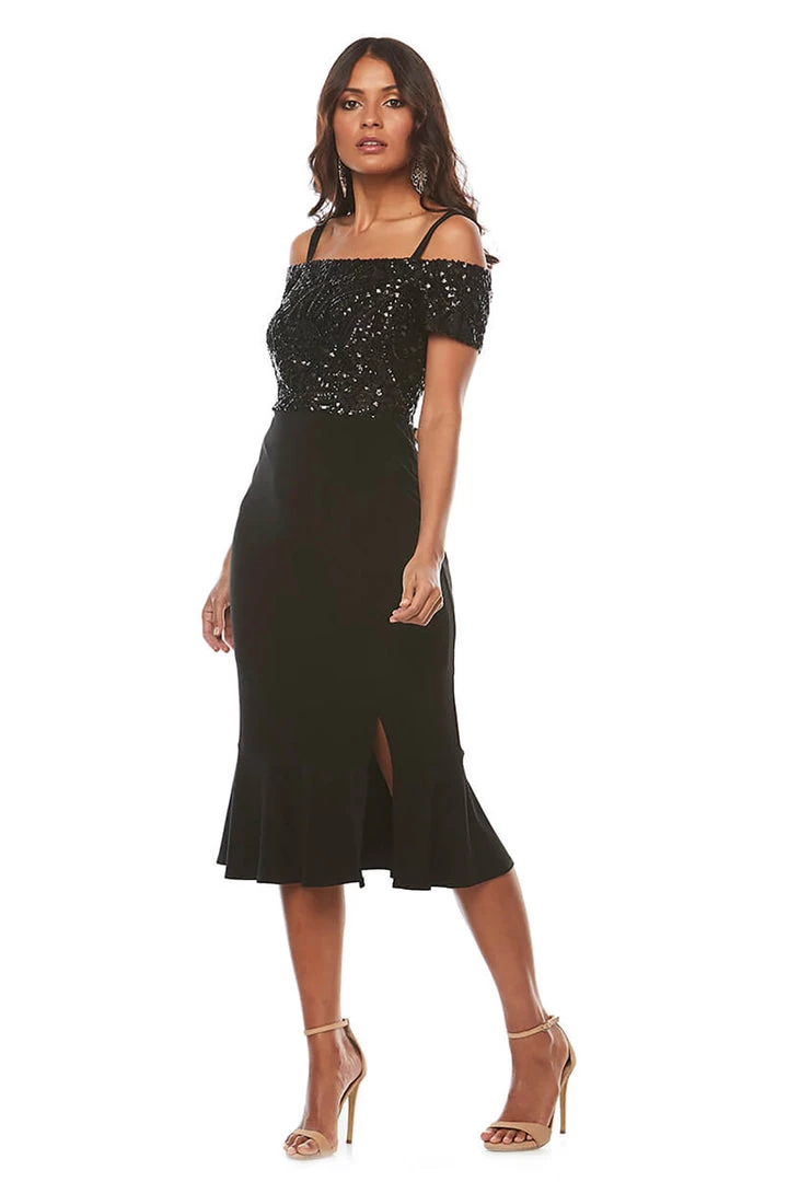 Every wardrobe needs a little black dress! This Cold Shoulder Sequin Dress by Zaliea is feminine and elegant with a touch of attitude! The sequinned bodice glitters, while the fit and flare skirt has a split for movability and style!Â