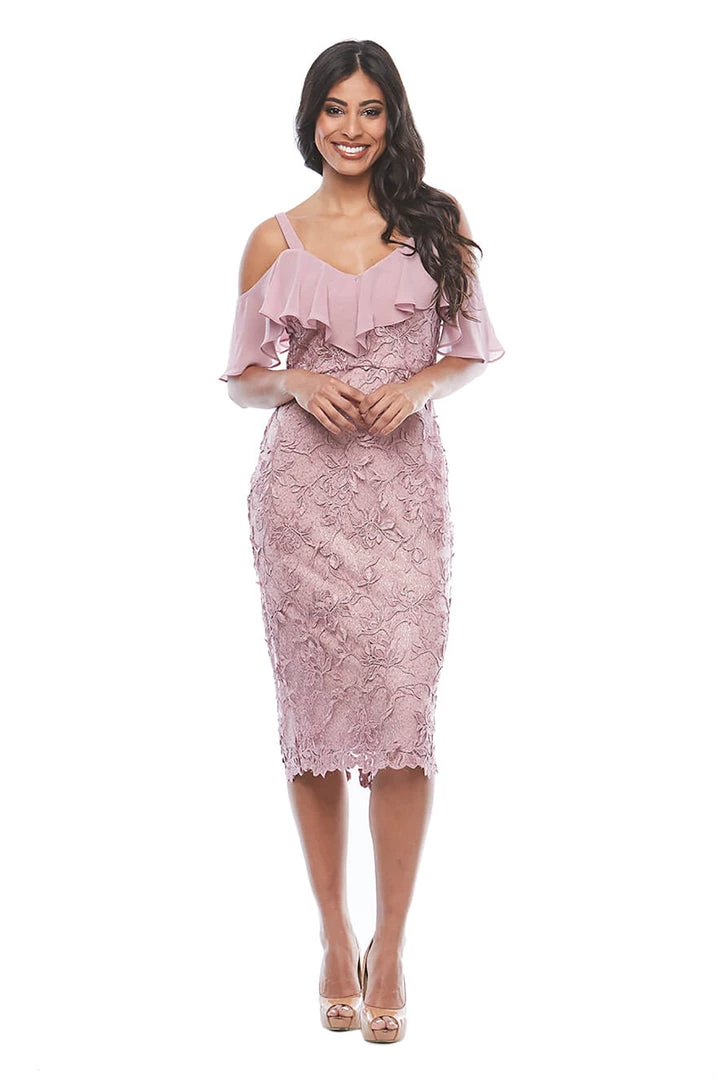 The Cold Shoulder Embroidered Lace Dress in Dusty Pink is a slice of sensational design that you’ll eat right up! With a feminine and elegant cold shoulder design that drapes chiffon across the neckline you’ll feel like royalty in this dress! Corded lace covers the rest of the dress adding a touch of Pizazz to your next wedding or event.