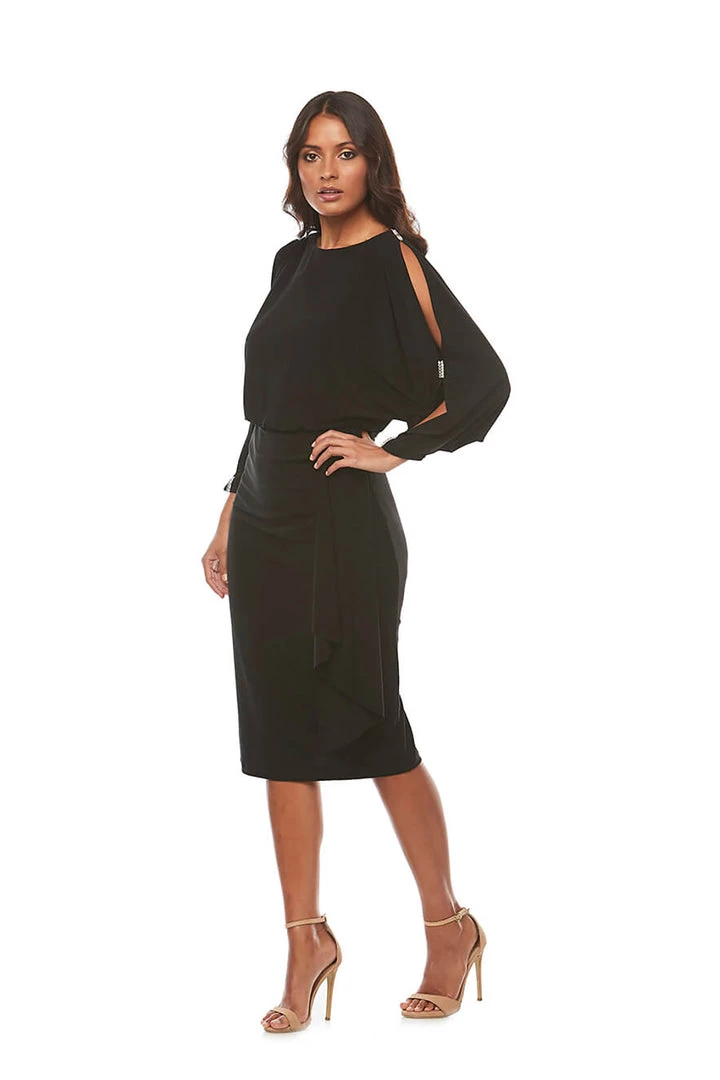 Every wardrobe needs a little black dress… This Zaliea long sleeve black dress is designed to make you feel like a Queen when you wear it! The Lillian Long Sleeve Dress is made of a soft touch stretch fabric. The skirt finished just below the knee and is a fitted shape, while the top blouses with a drape, flattering al shapes! Split sleeves add a touch of Pizazz to your next party, wedding or races outing! Blouson stretch jersey dress with diamonte detail on sleeves.